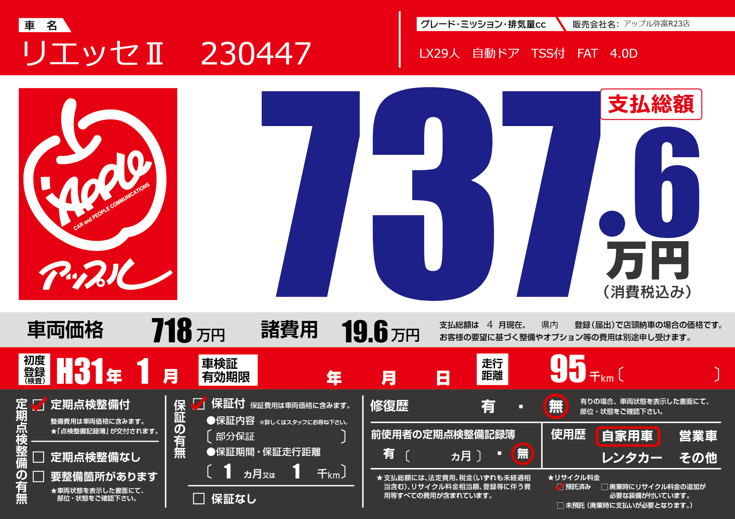 | 走行キロ | 9.5万km | 初年度登録 | H31年1月 |