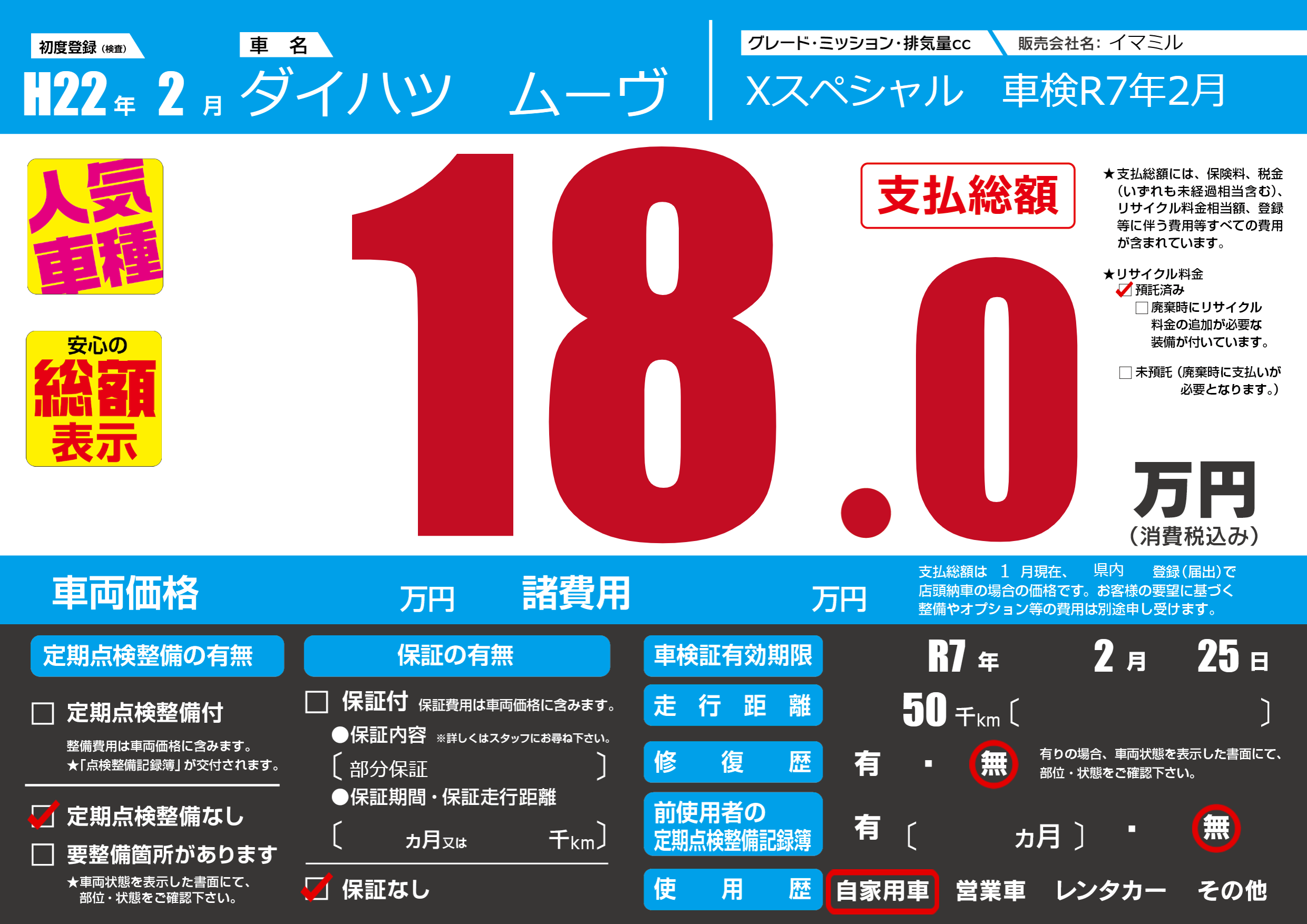 | 走行キロ | 5万km | 初年度登録 | H22年2月 |