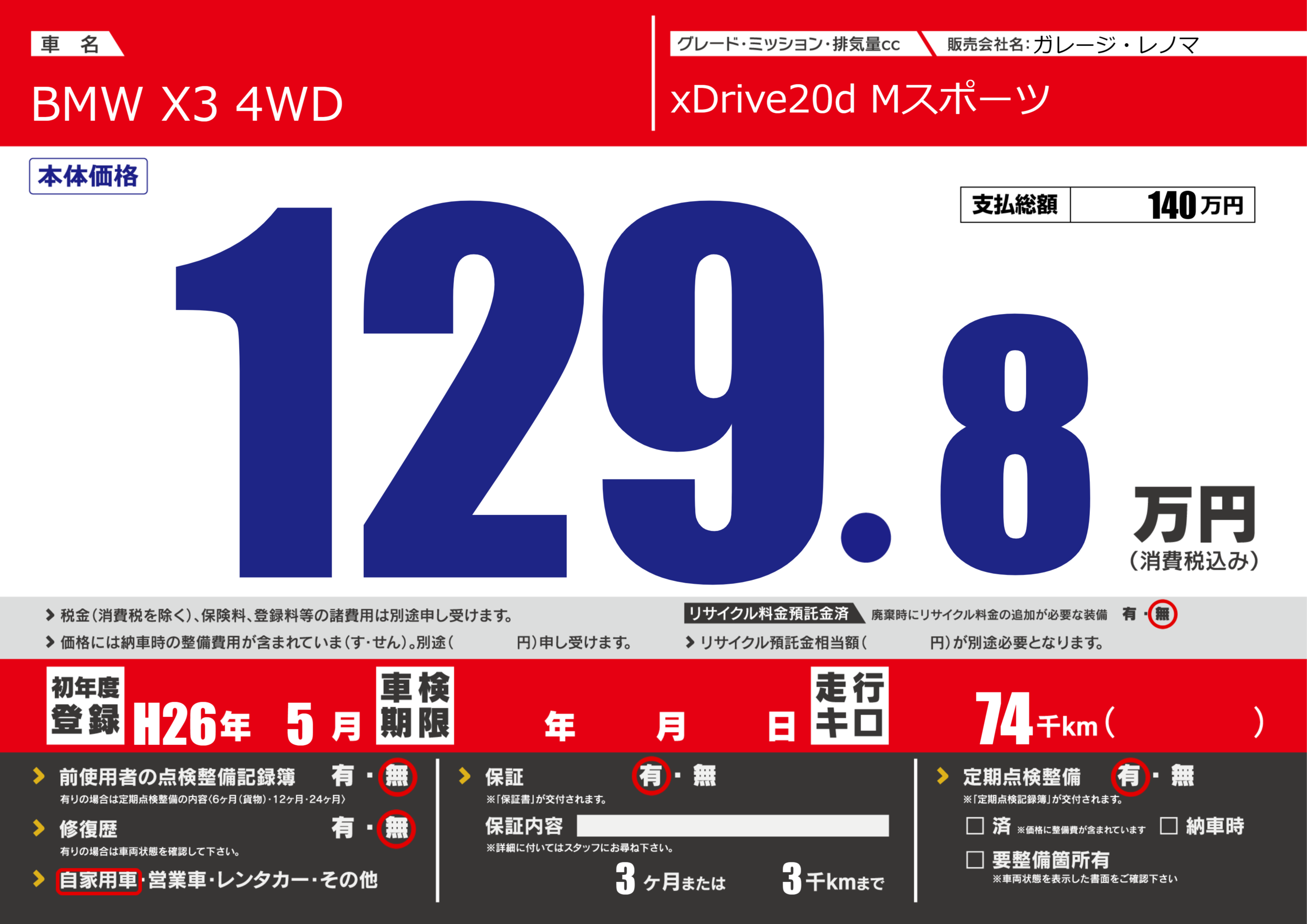 保証付き 保証内容(---) 3ヶ月または(3)千kmまで |