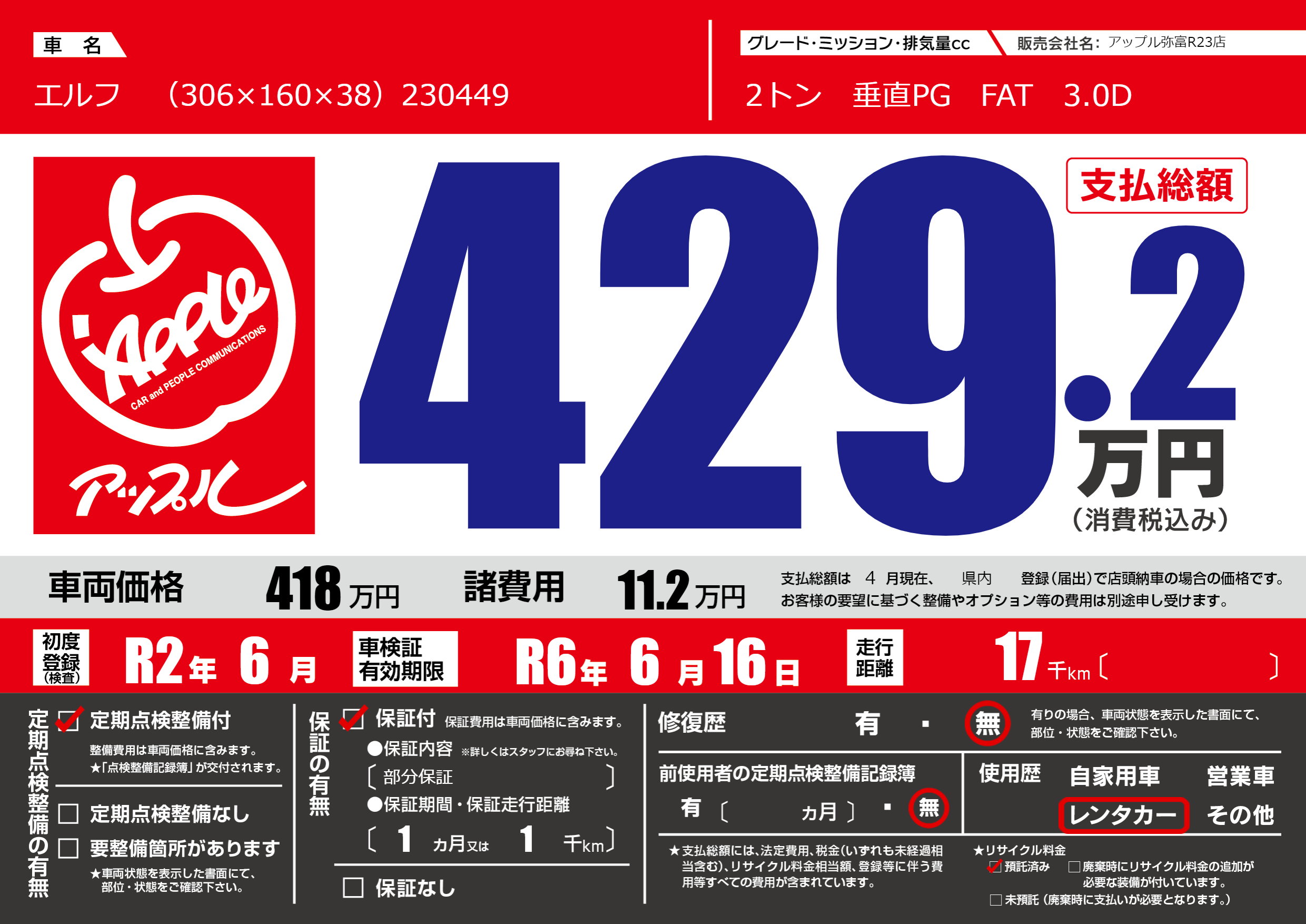 | 車名 | エルフ (306×160×38)230449 | グレード ミッション 排気量 |