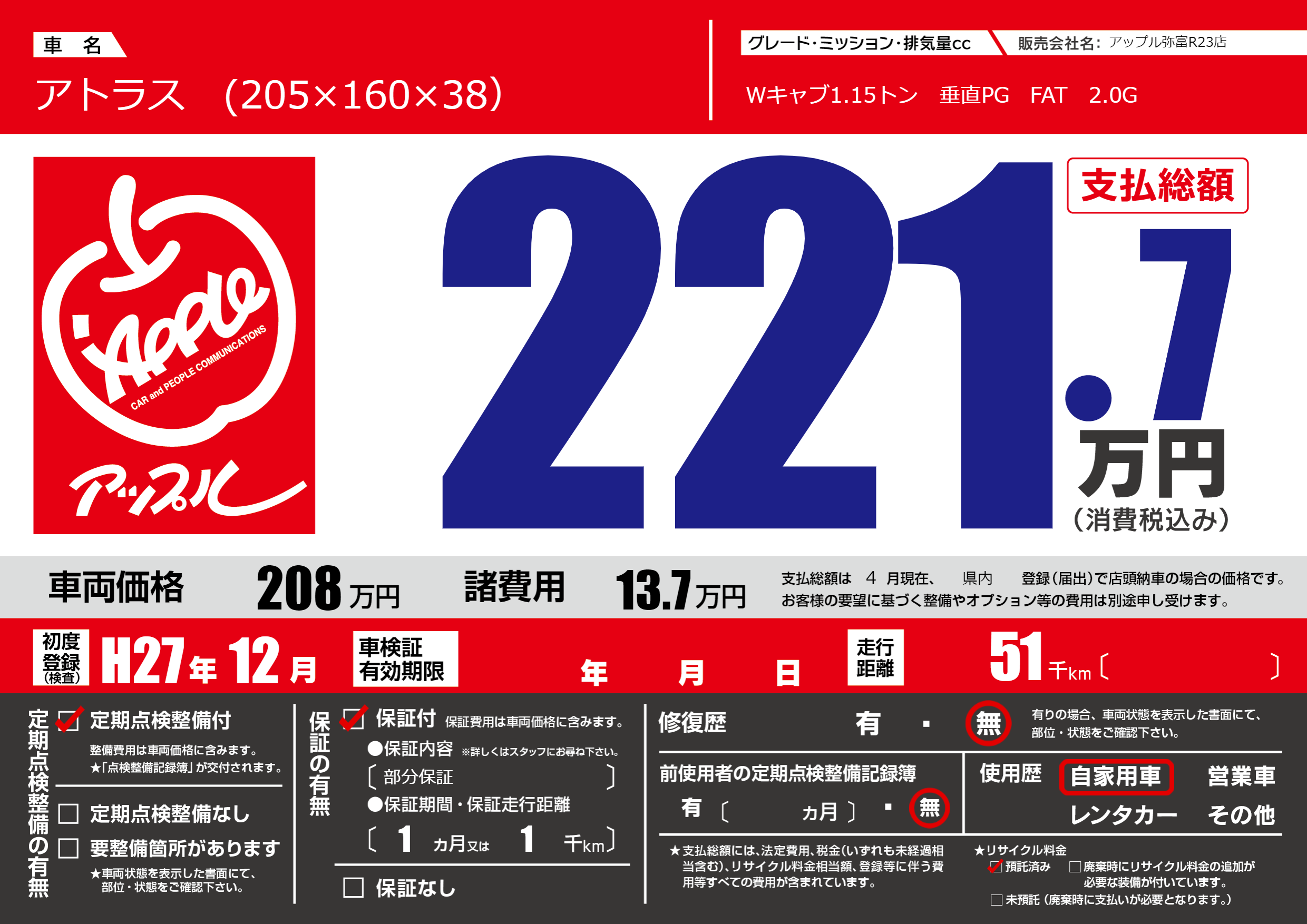 | 車名 | アトラス (205×160×38) | グレード ミッション 排気量 |