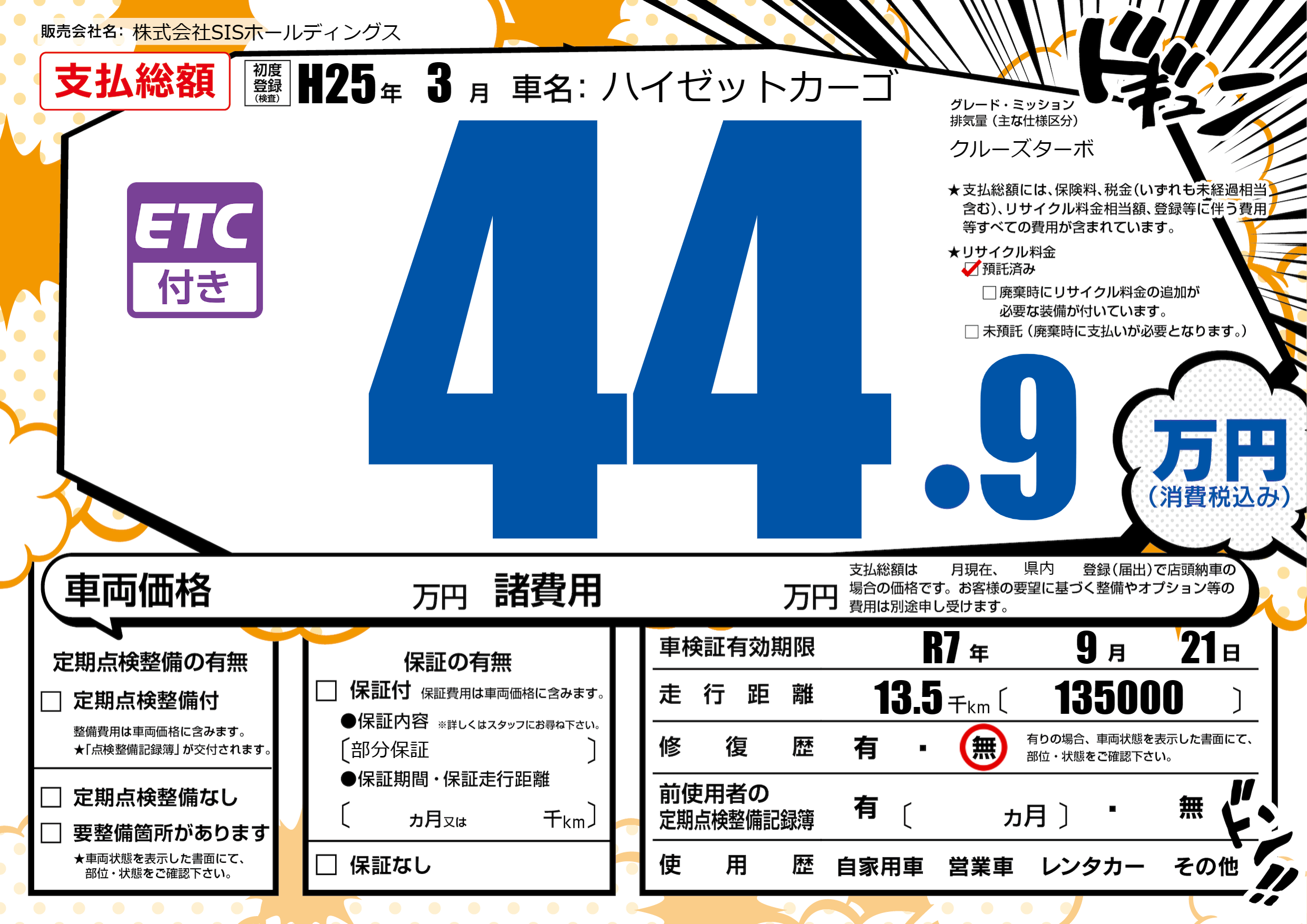 | 車名 | ハイゼットカーゴ | グレード ミッション 排気量 |