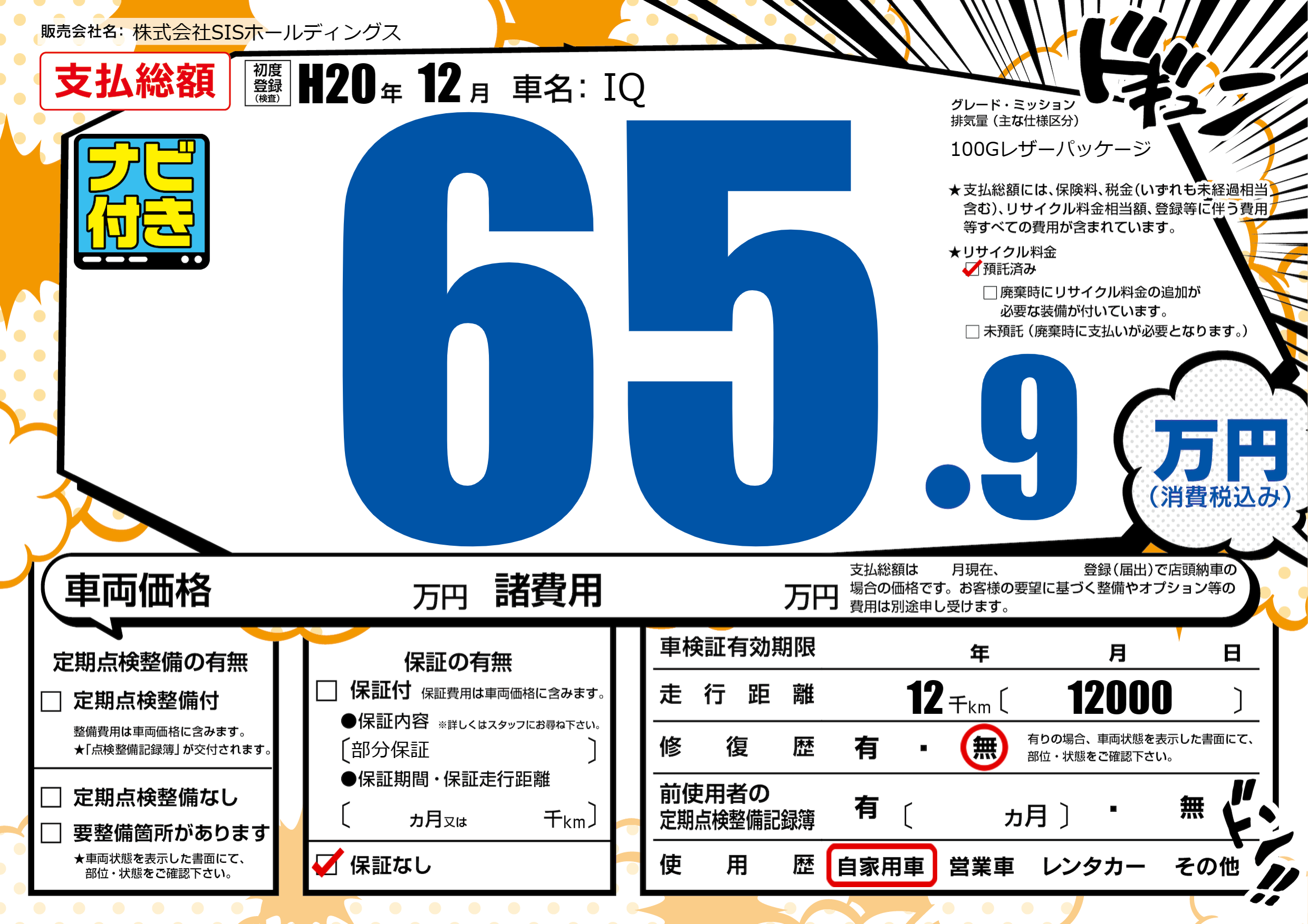 | 走行キロ | 1.2万km | 初年度登録 | H20年12月 |