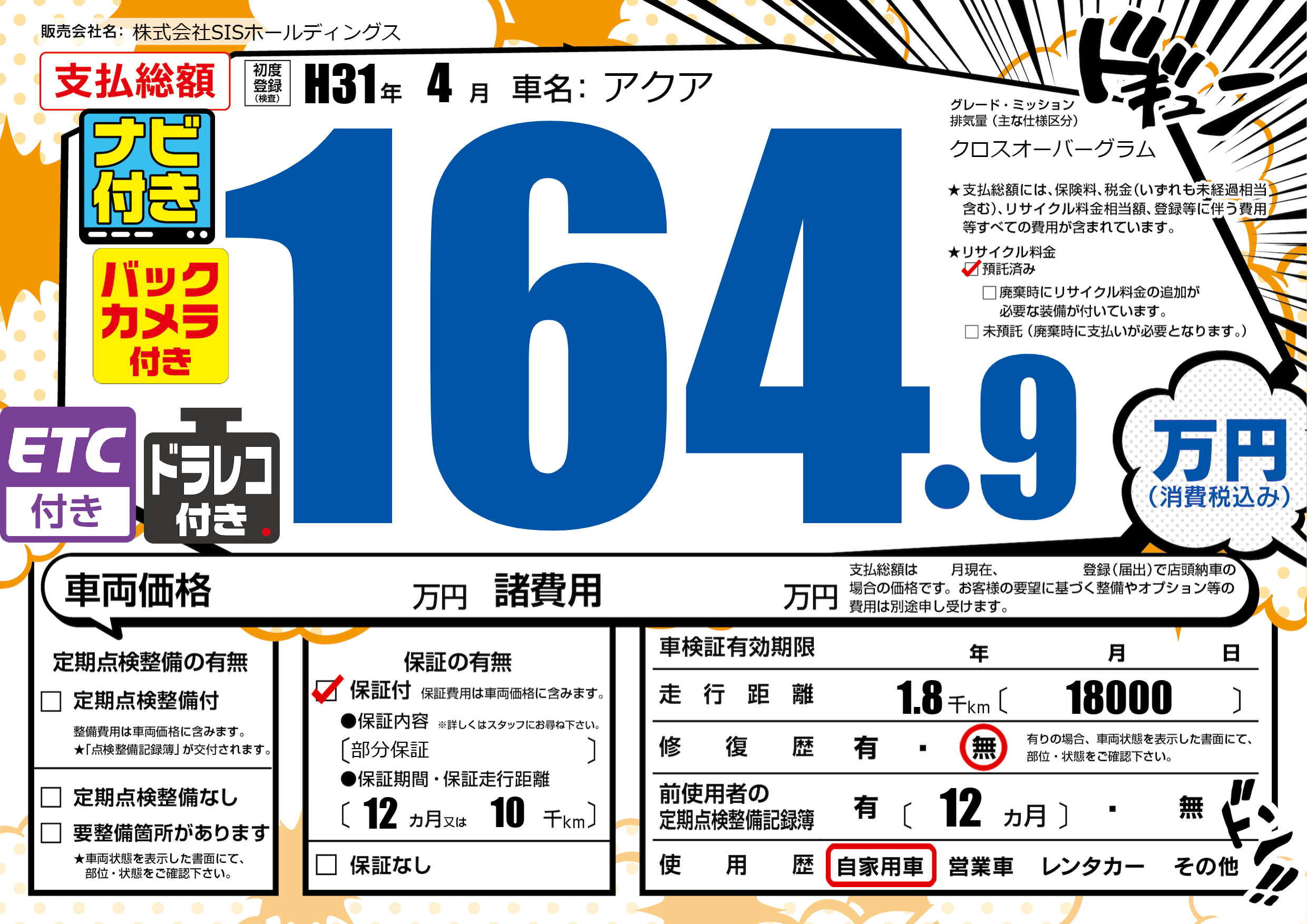 | 走行キロ | 0.1万km | 初年度登録 | H31年4月 |
