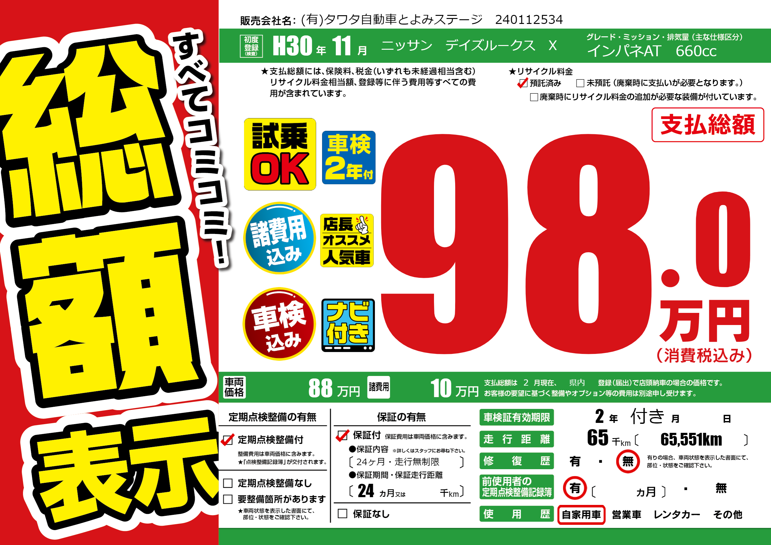 | 車名 | ニッサン デイズルークス X | グレード ミッション 排気量 |