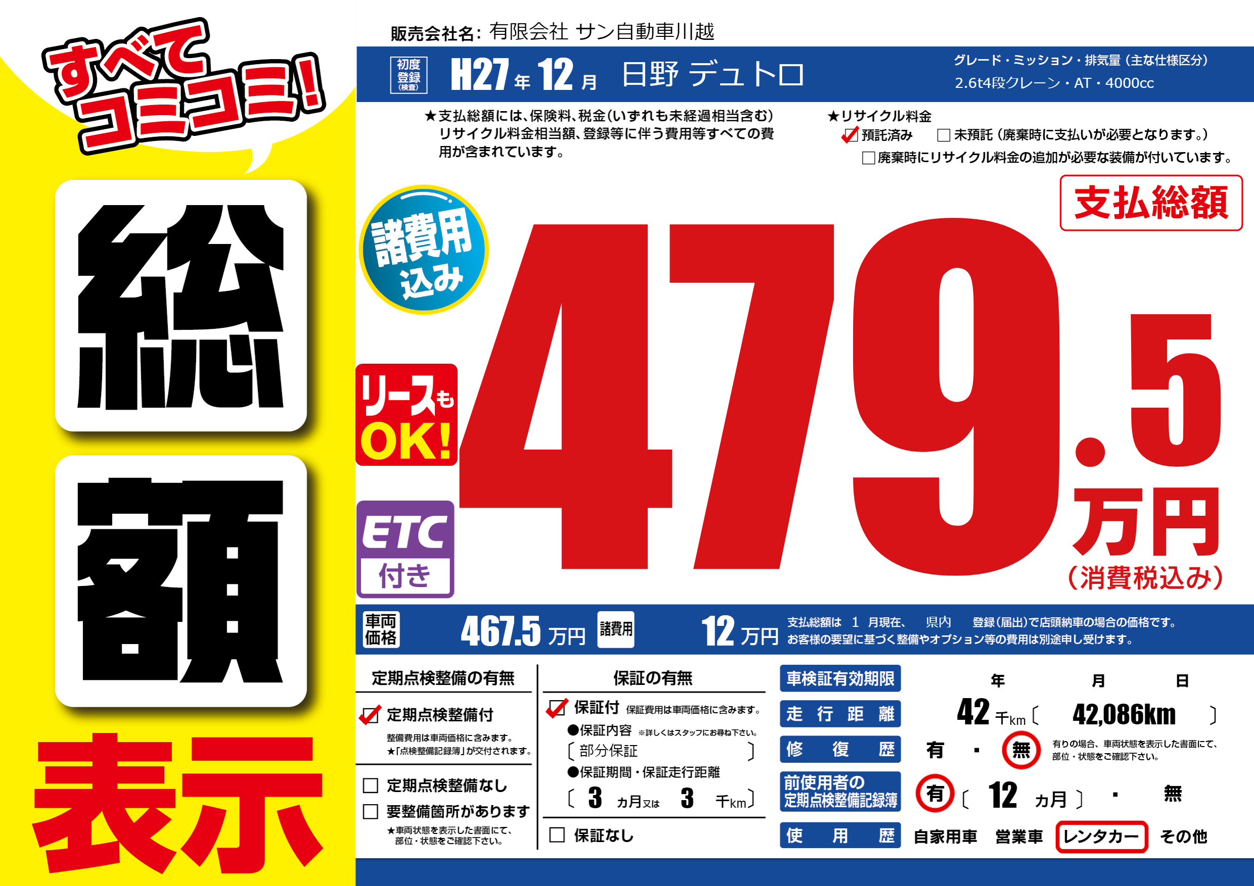 | 車名 | 日野 デュトロ | グレード ミッション 排気量 |