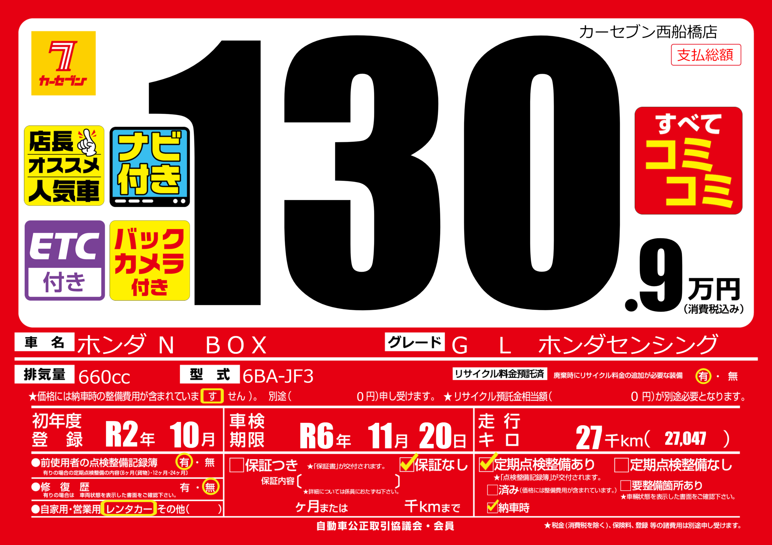 | 定期点検整備 | 定期点検整備あり 納車時あり | ||