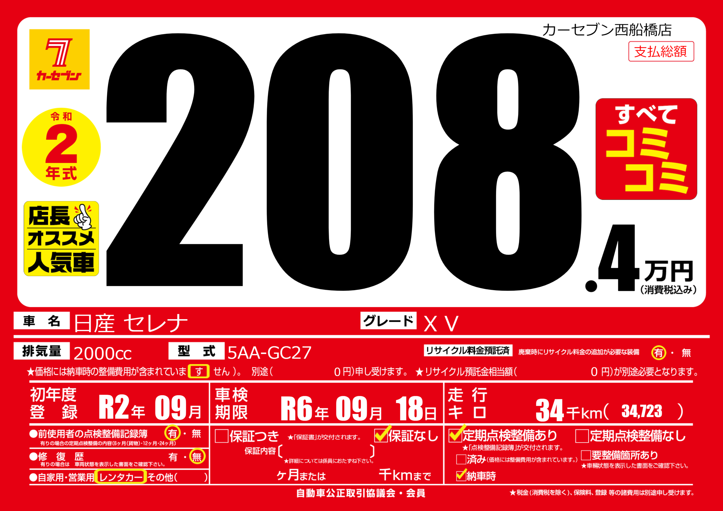 | 車名 | 日産 セレナ | グレード ミッション 排気量 |