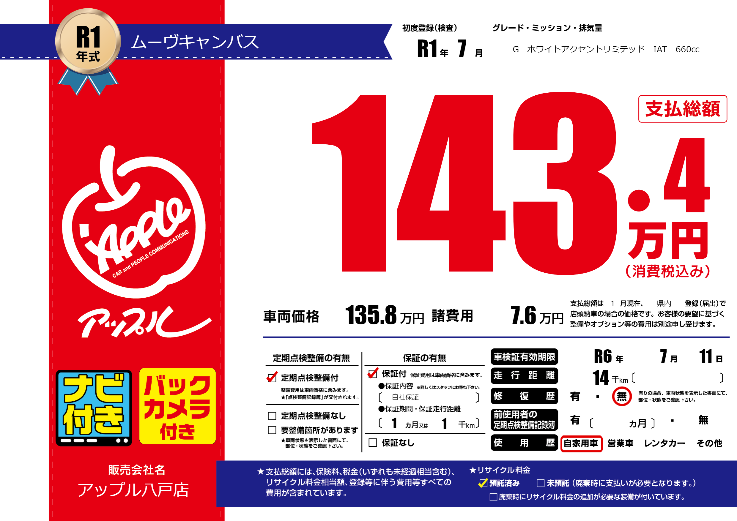 | 走行キロ | 1.4万km | 初年度登録 | R1年7月 |
