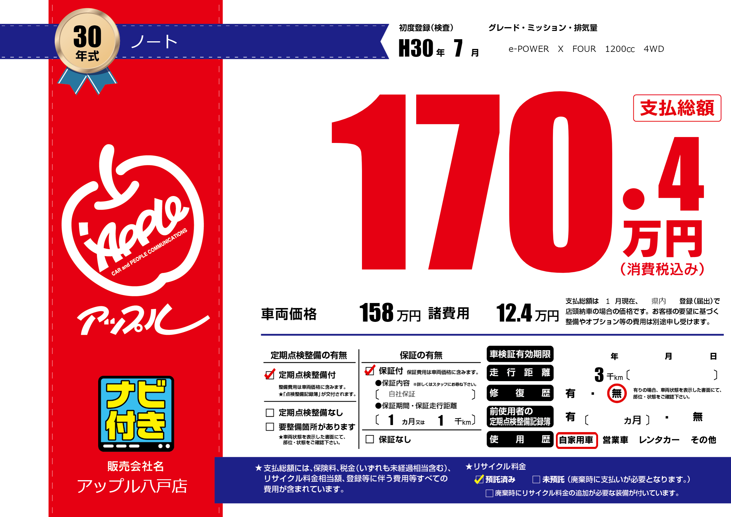 保証付き 保証内容( 自社保証) 1ヶ月または(1)千kmまで |