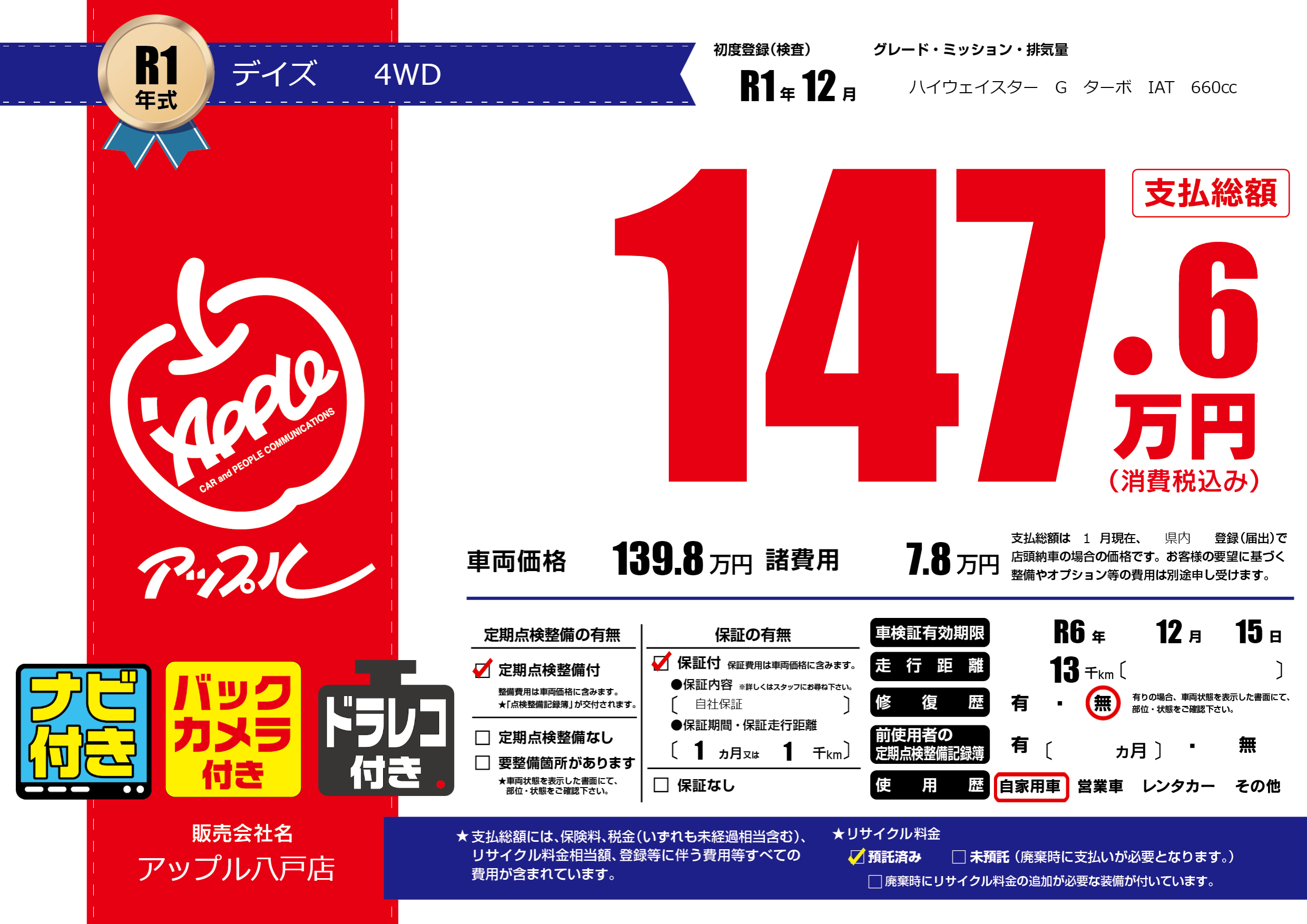 | 車検制限 | R6年 12月 15日 | ||