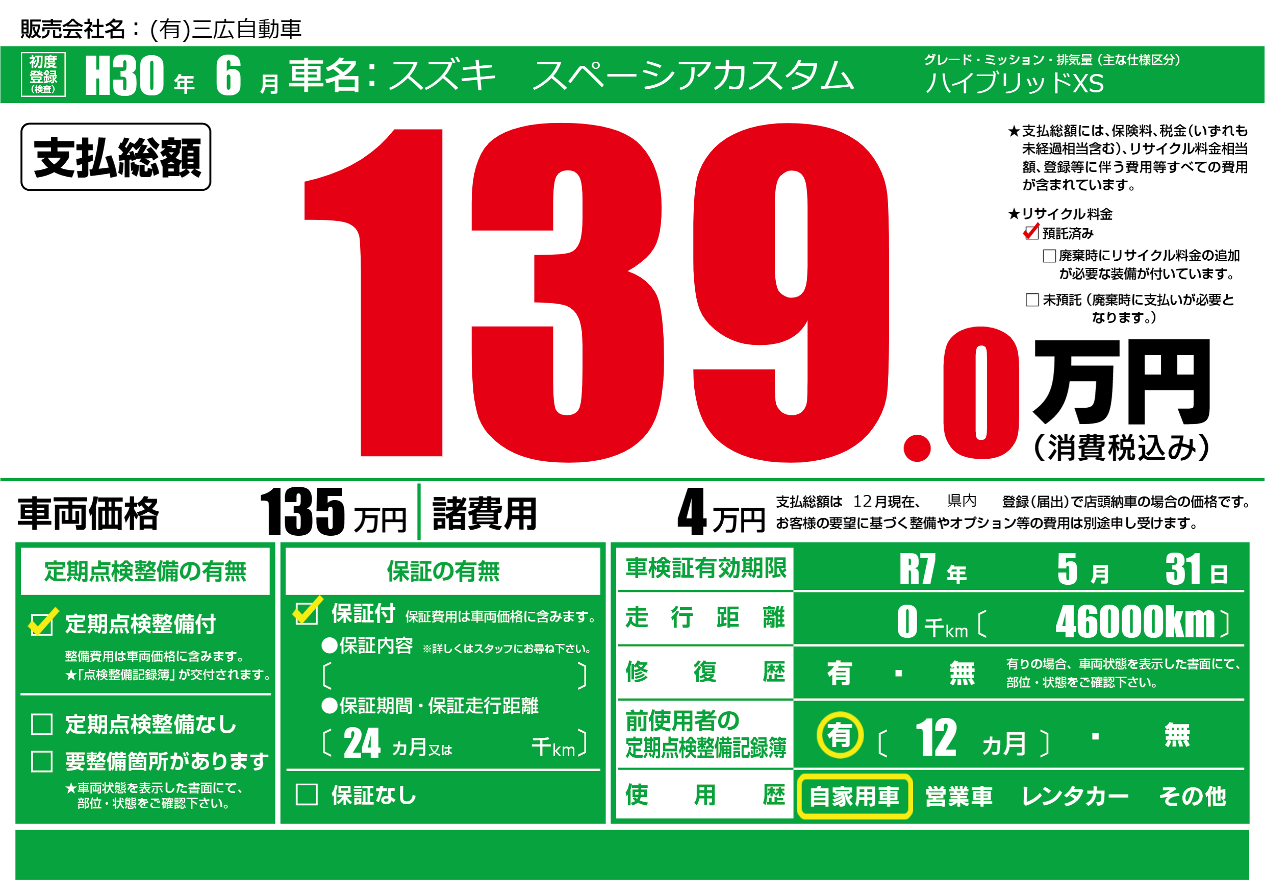 | 車名 | スズキ スペーシアカスタム | グレード ミッション 排気量 |
