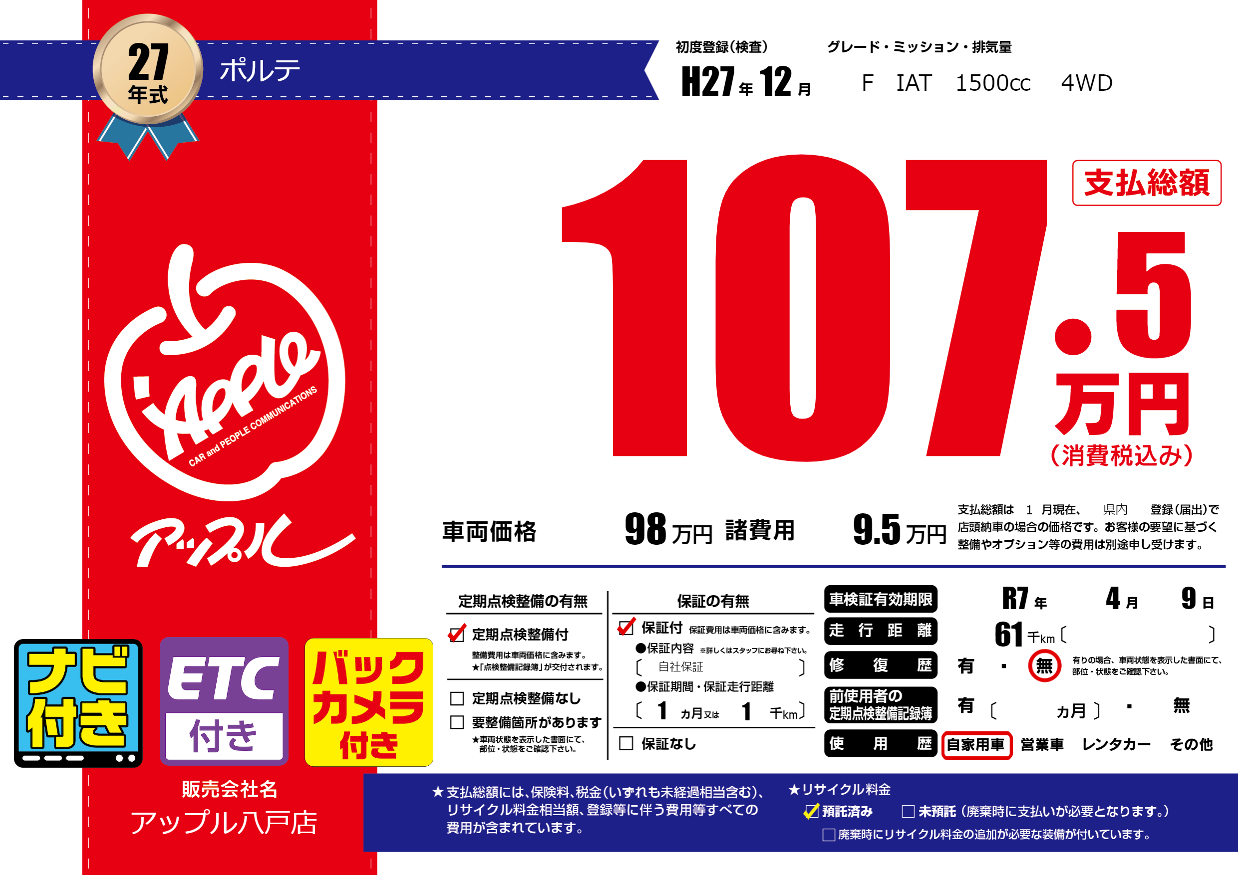 | 車名 | ポルテ | グレード ミッション 排気量 |
