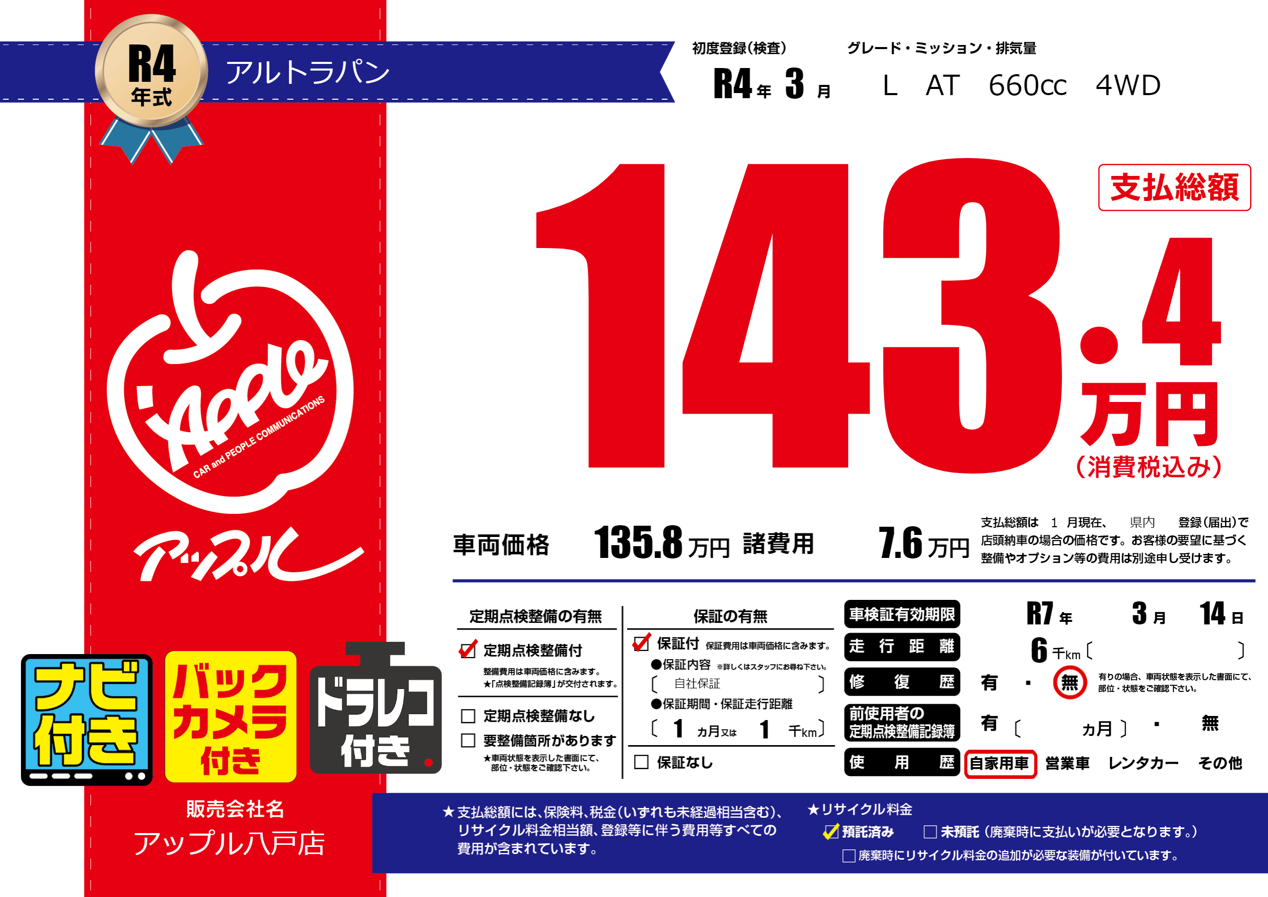 | 走行キロ | 0.6万km | 初年度登録 | R4年3月 |