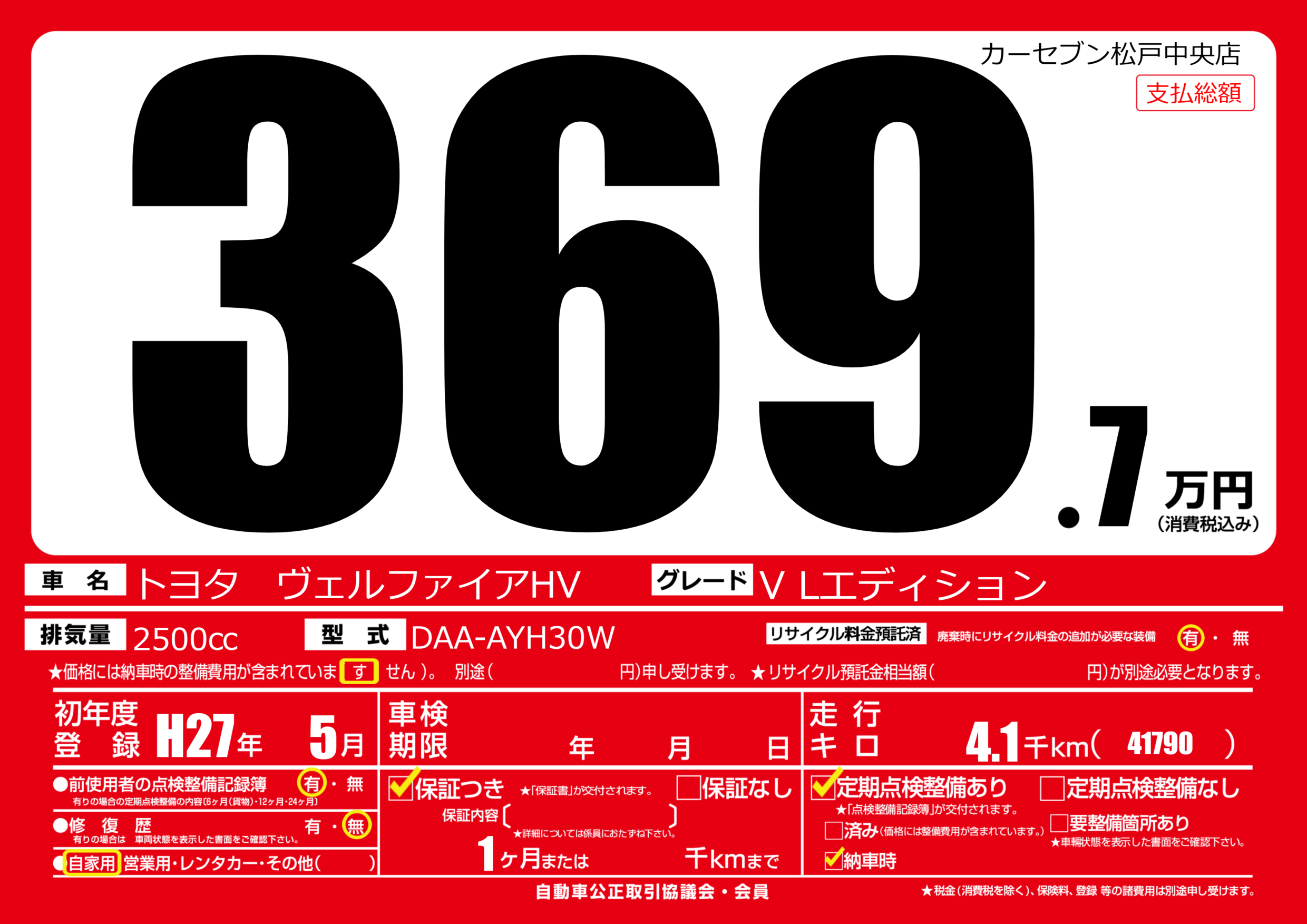 | 車名 | トヨタ ヴェルファイアHV | グレード ミッション 排気量 |
