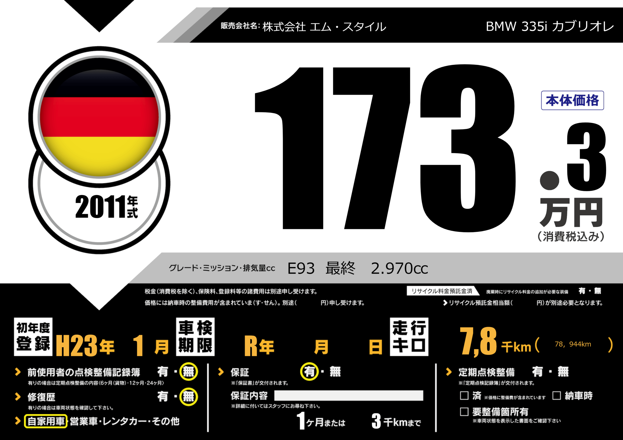 | 車名 | BMW 335i カブリオレ | グレード ミッション 排気量 |