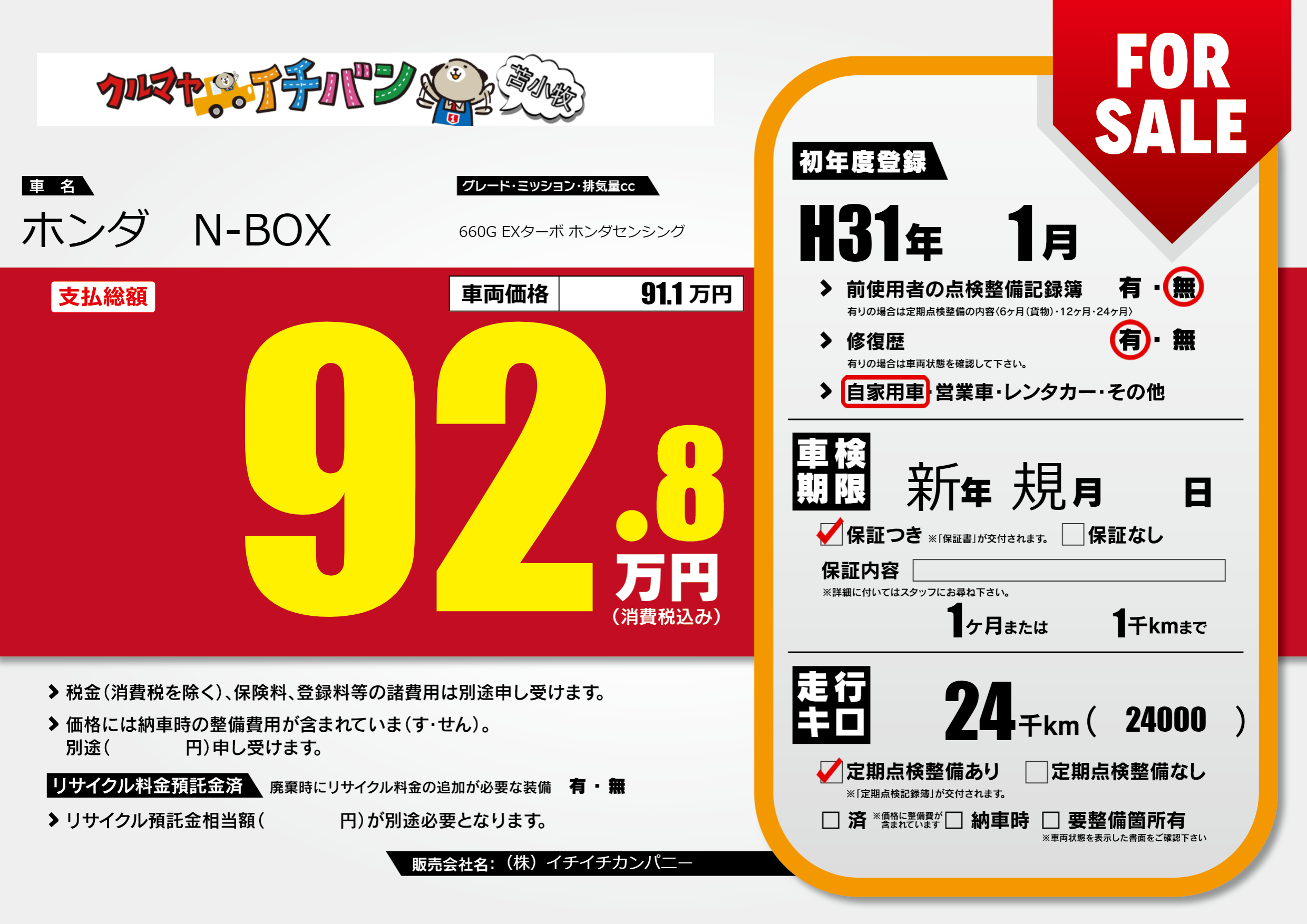| 車名 | ホンダ N-BOX | グレード ミッション 排気量 |