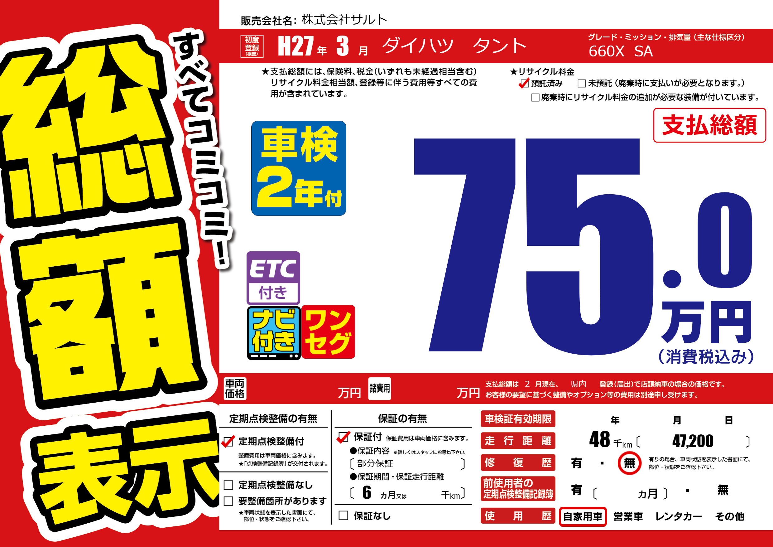 | 車名 | ダイハツ タント | グレード ミッション 排気量 |