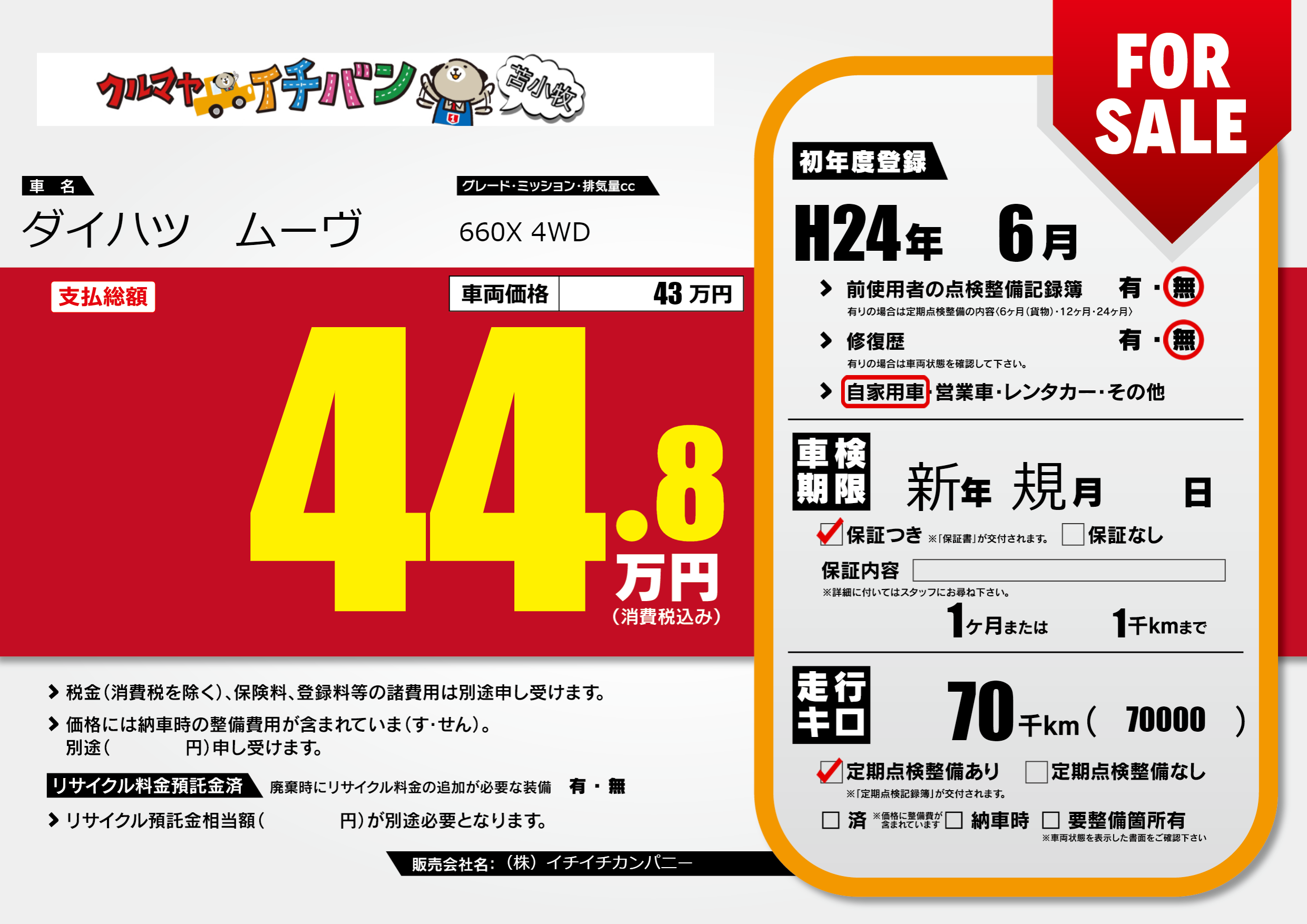 | 走行キロ | 7万km | 初年度登録 | H24年6月 |