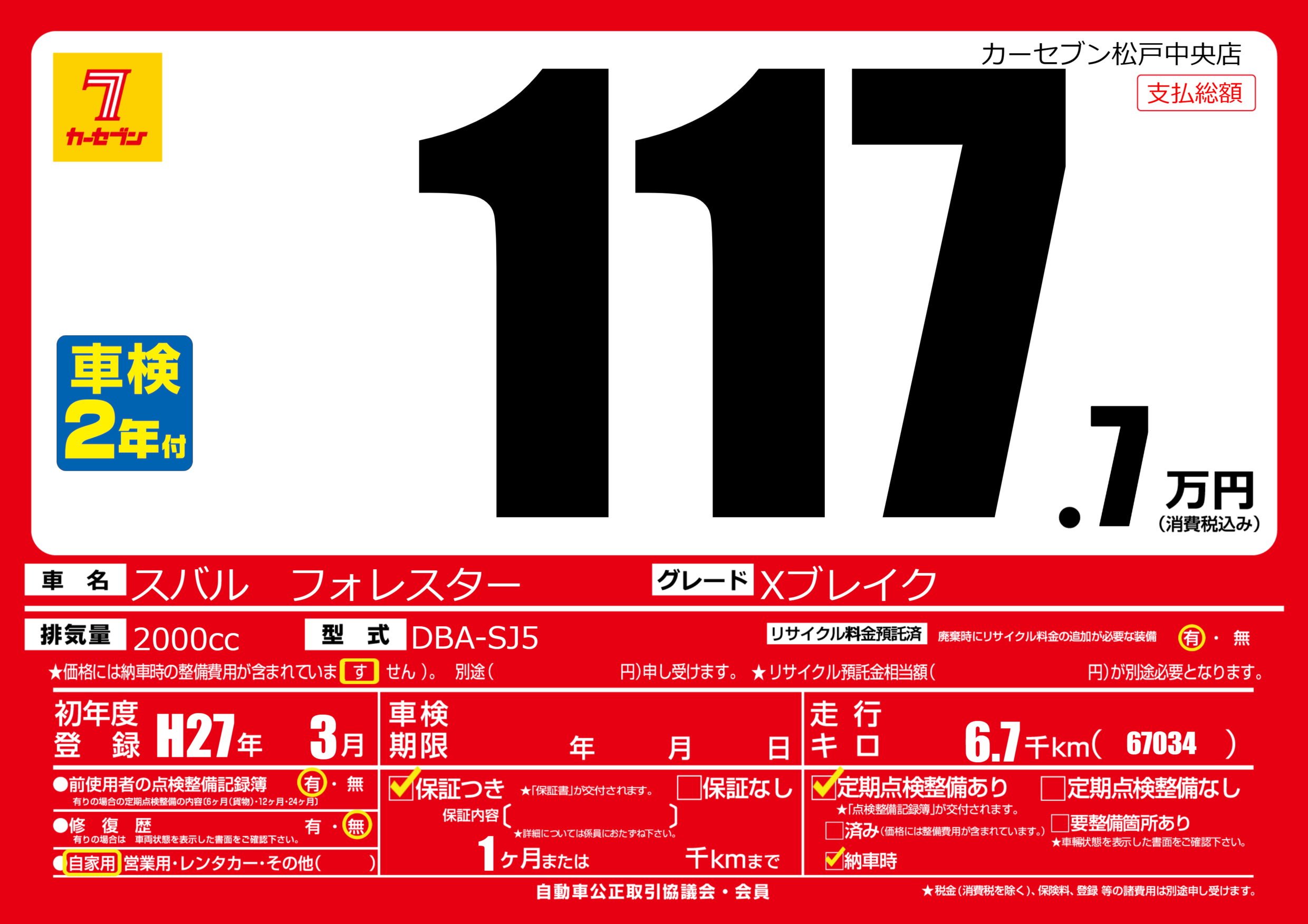 | 車名 | スバル フォレスター | グレード ミッション 排気量 |