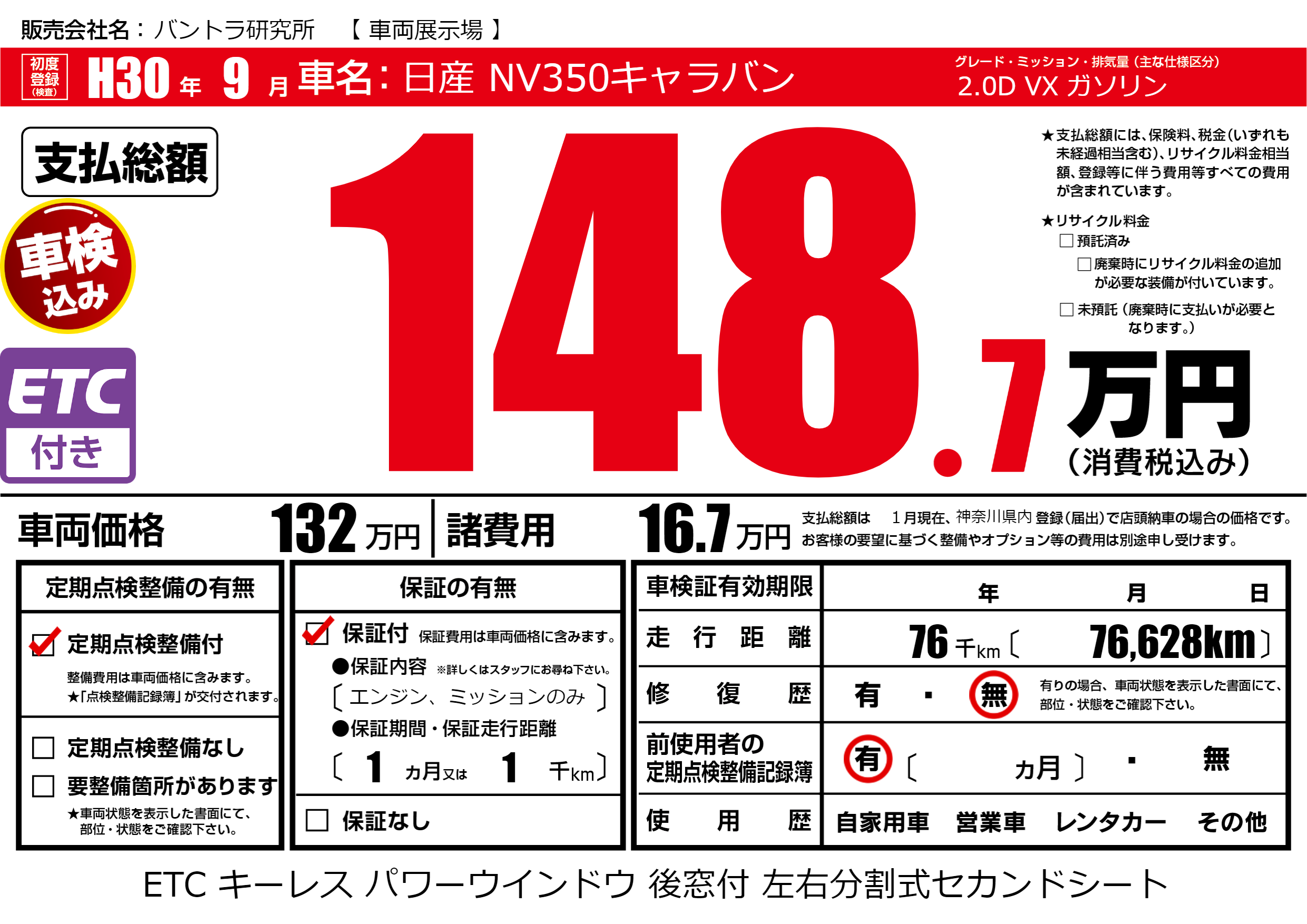 | 車名 | 日産 NV350キャラバン | グレード ミッション 排気量 |