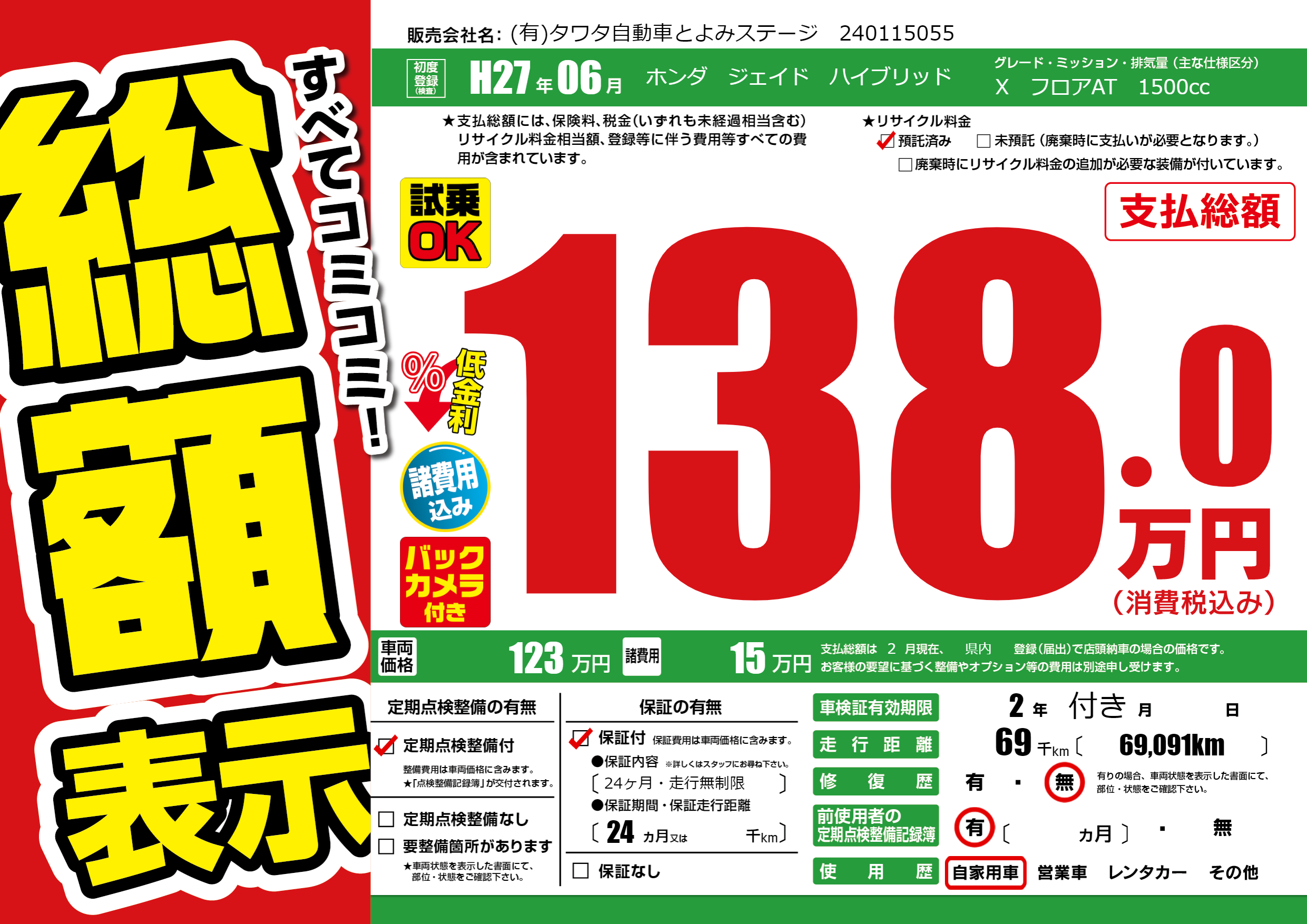 | 走行キロ | 6.9万km | 初年度登録 | H27年06月 |