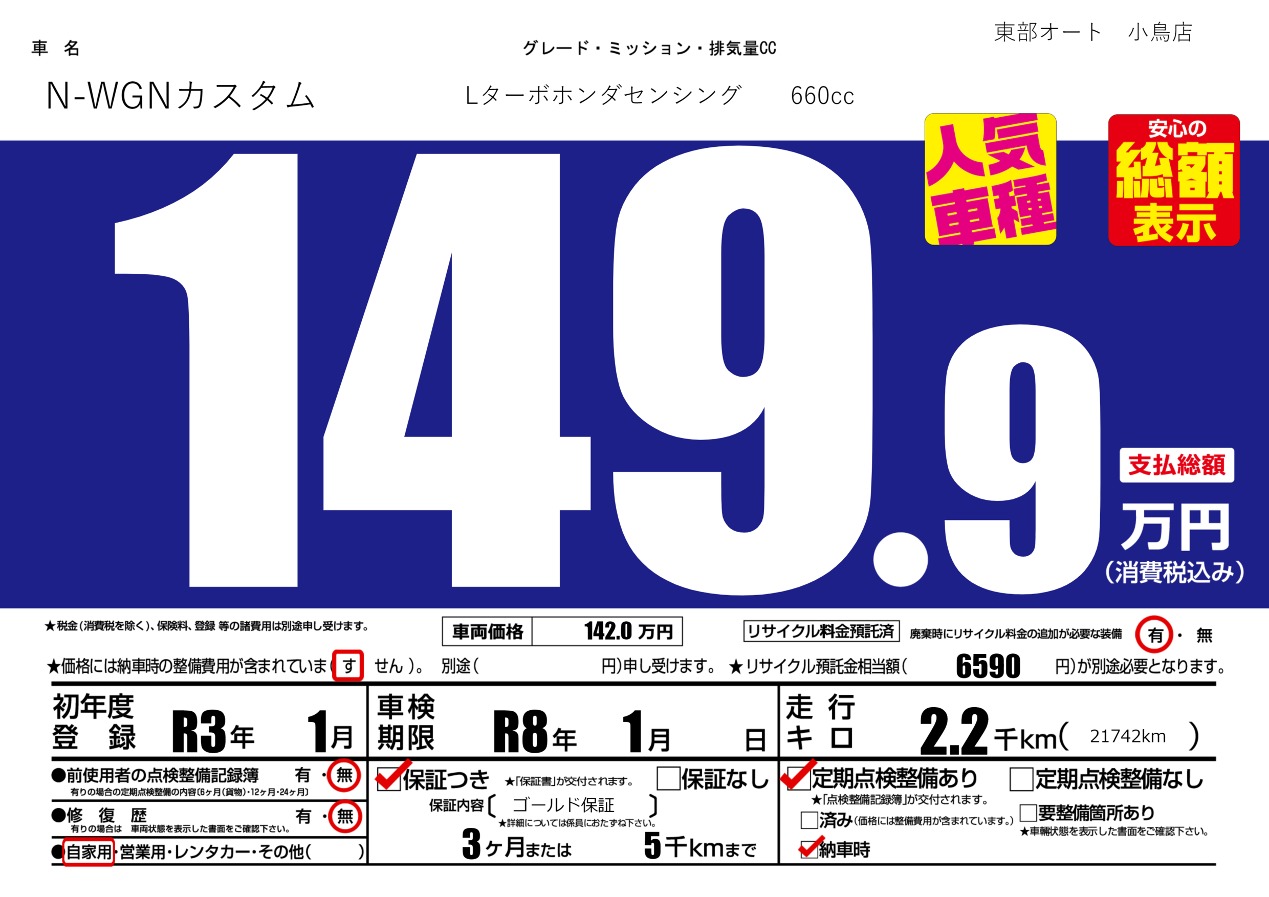 保証付き 保証内容( ゴールド保証) 3ヶ月または(5)千kmまで |