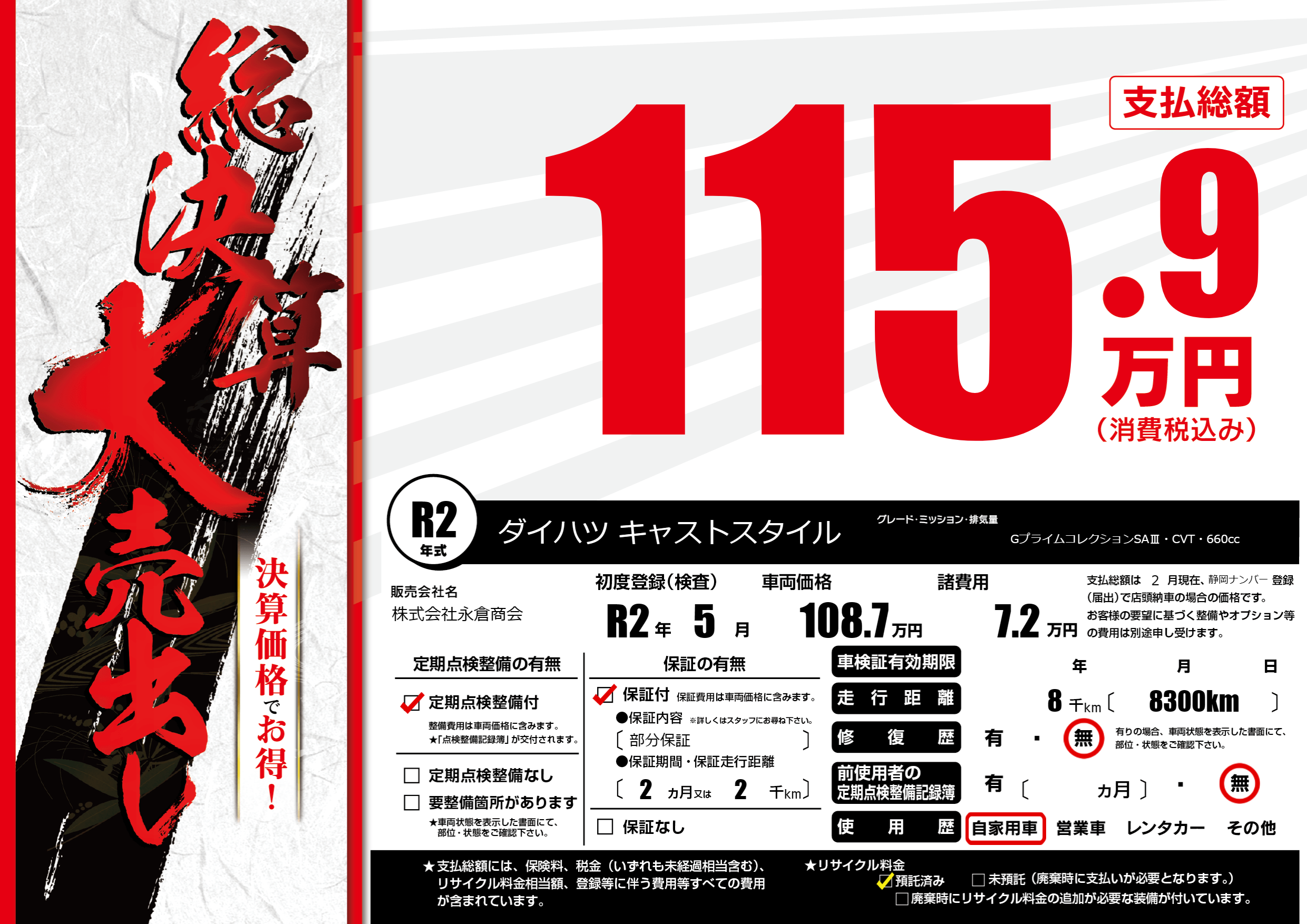 | 走行キロ | 0.8万km | 初年度登録 | R2年5月 |
