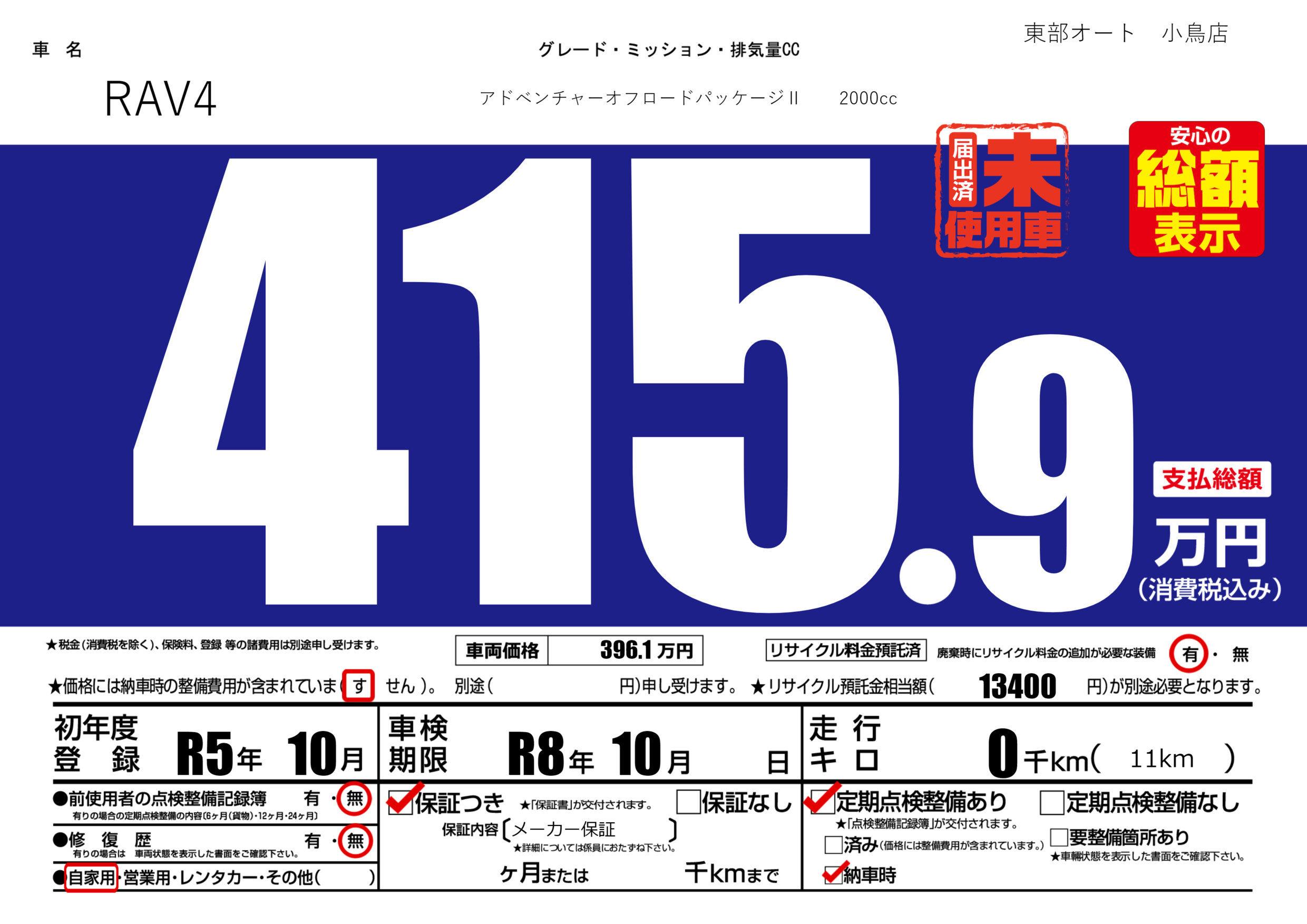 | 定期点検整備 | 定期点検整備あり 納車時あり | ||