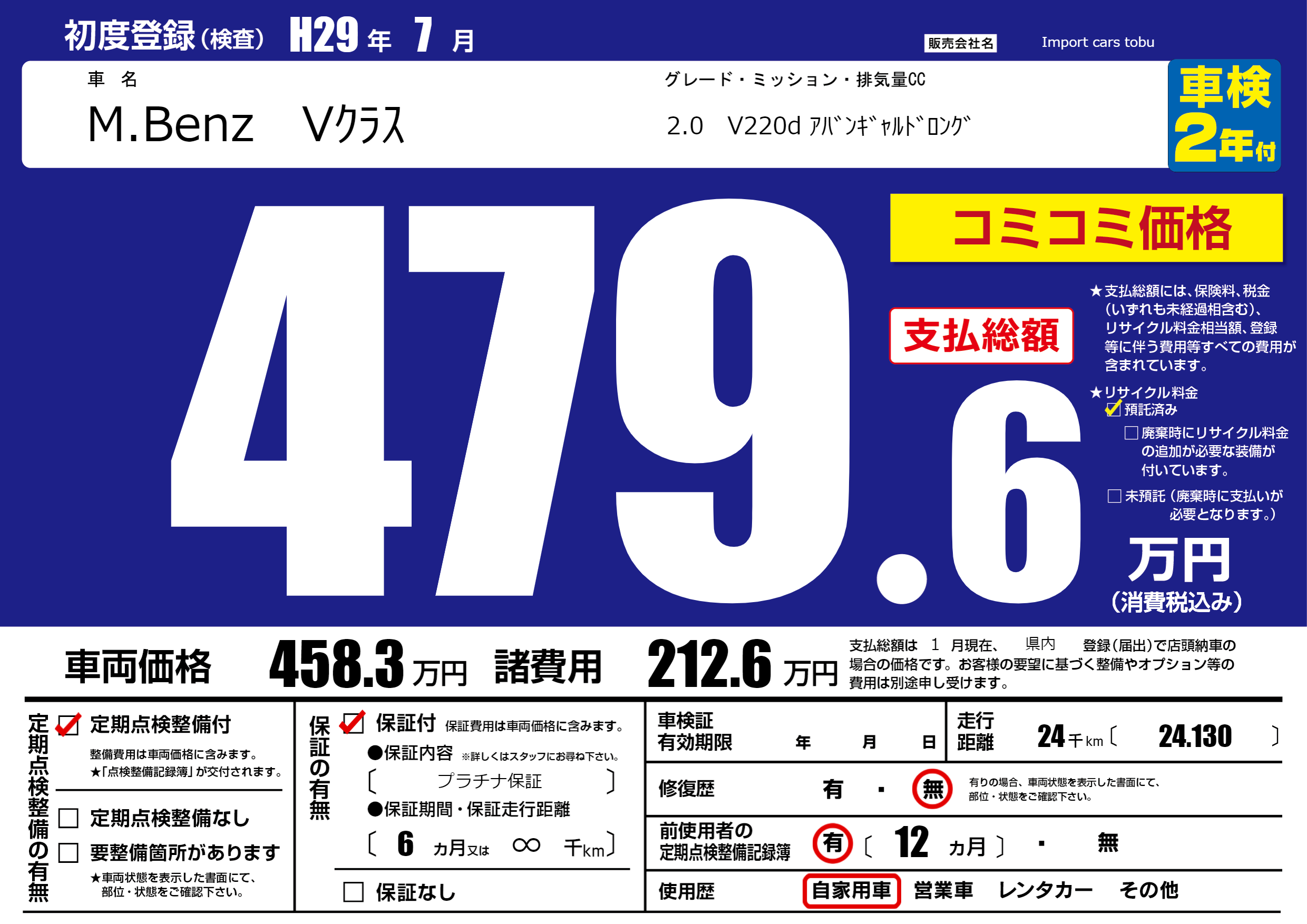 | 車名 | M.Benz Vクラス | グレード ミッション 排気量 |