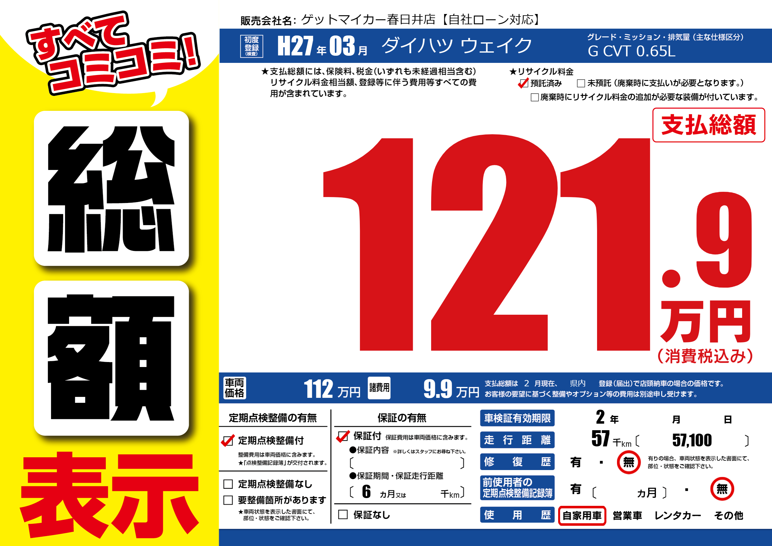 | 車名 | ダイハツ ウェイク | グレード ミッション 排気量 |