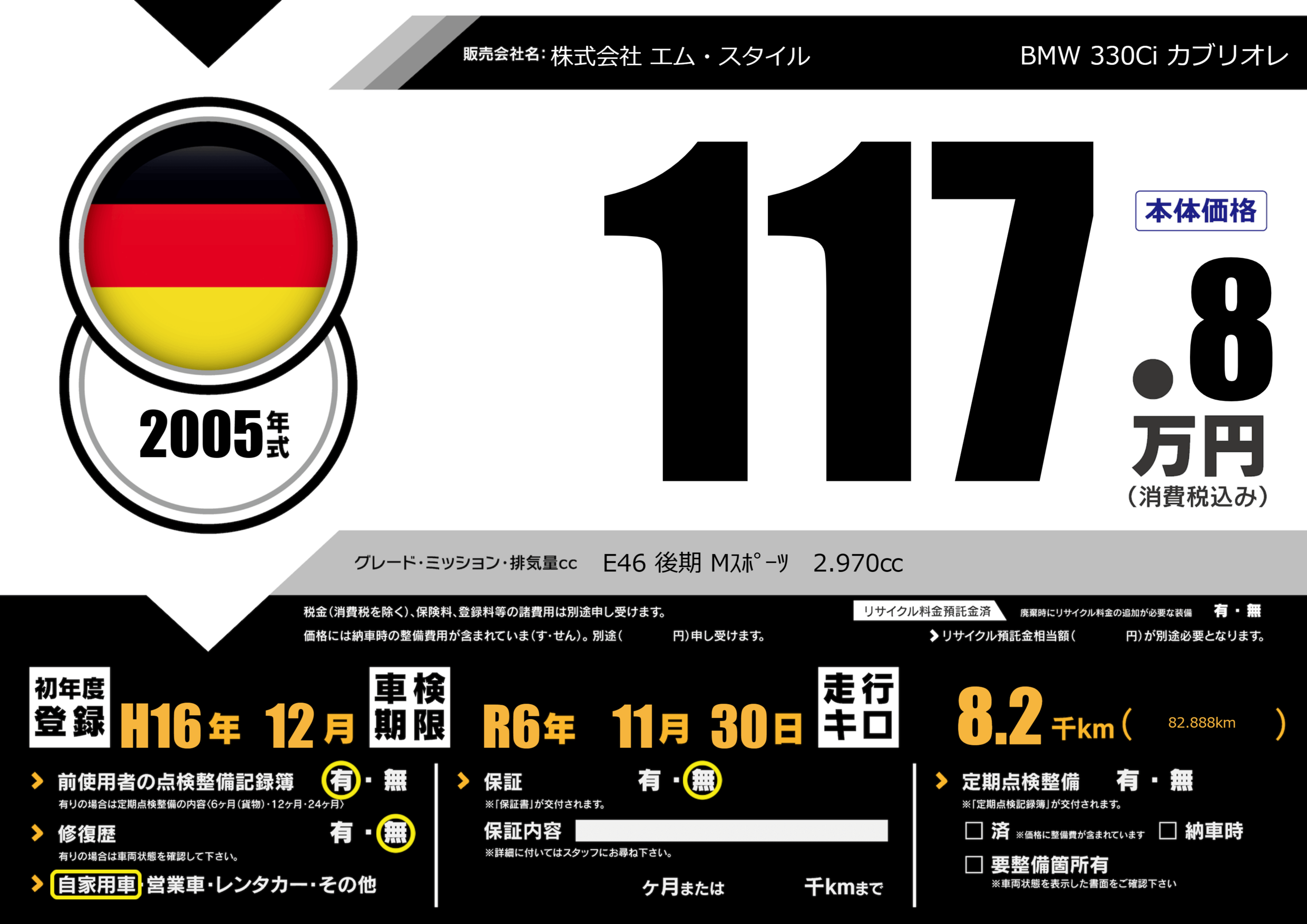 | 車名 | BMW 330Ci カブリオレ | グレード ミッション 排気量 |