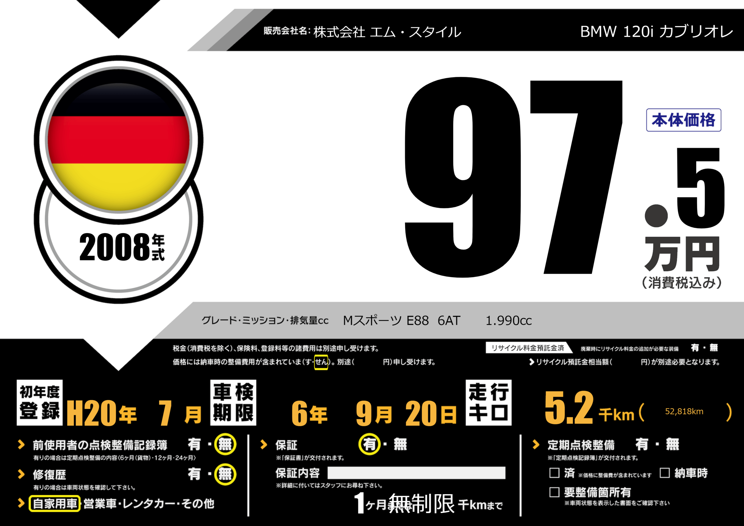| 車名 | BMW 120i カブリオレ | グレード ミッション 排気量 |