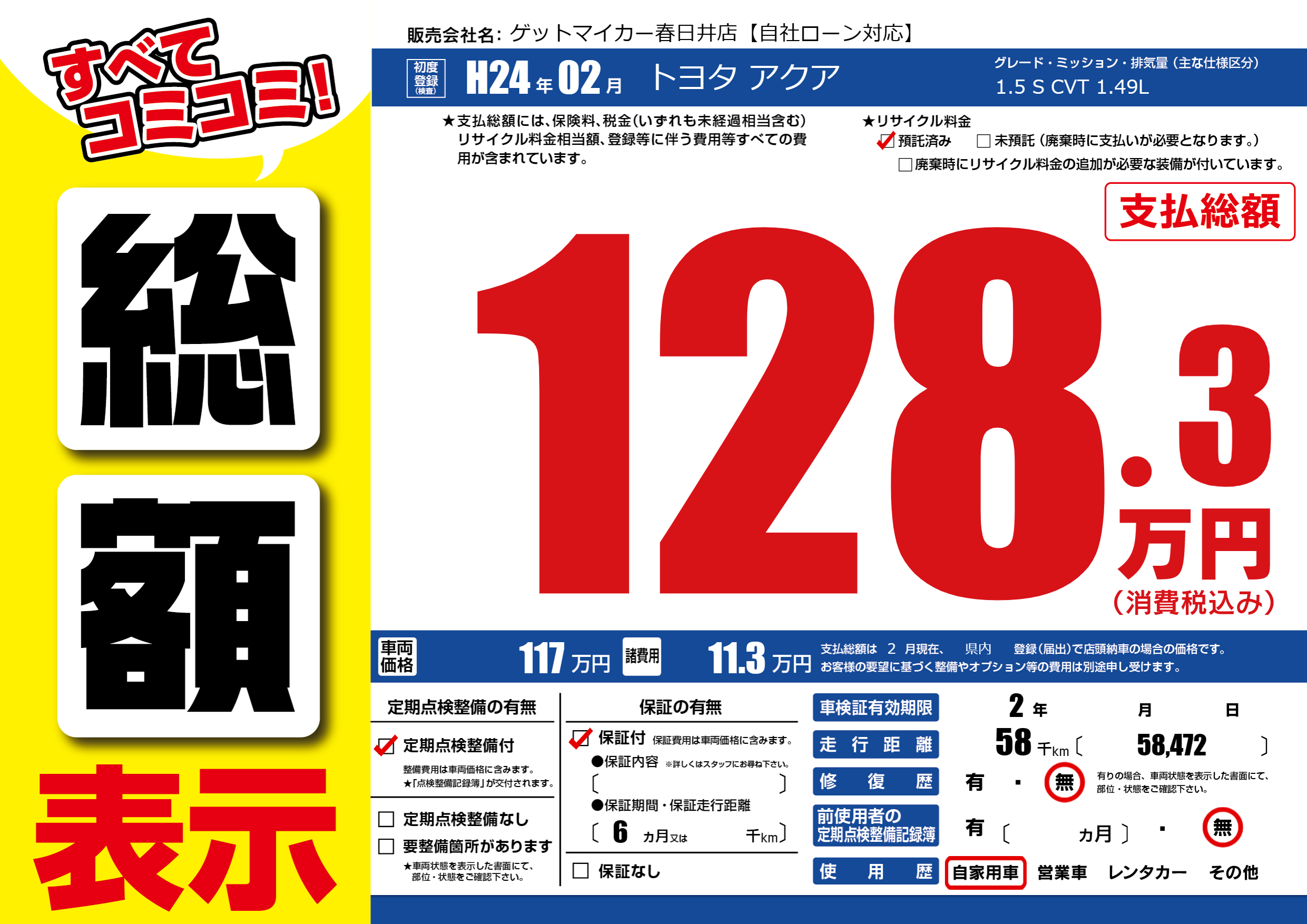 | 車名 | トヨタ アクア | グレード ミッション 排気量 |