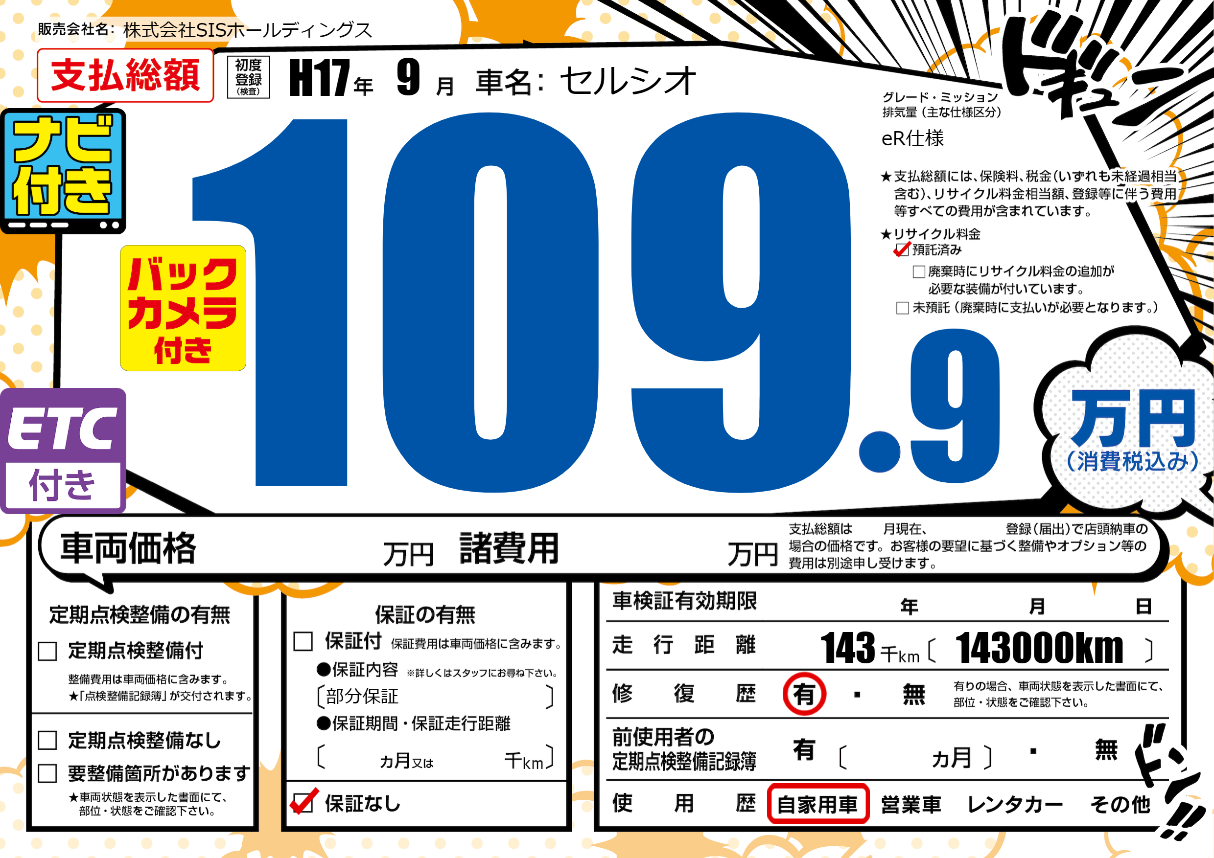 | 走行キロ | 14.3万km | 初年度登録 | H17年9月 |