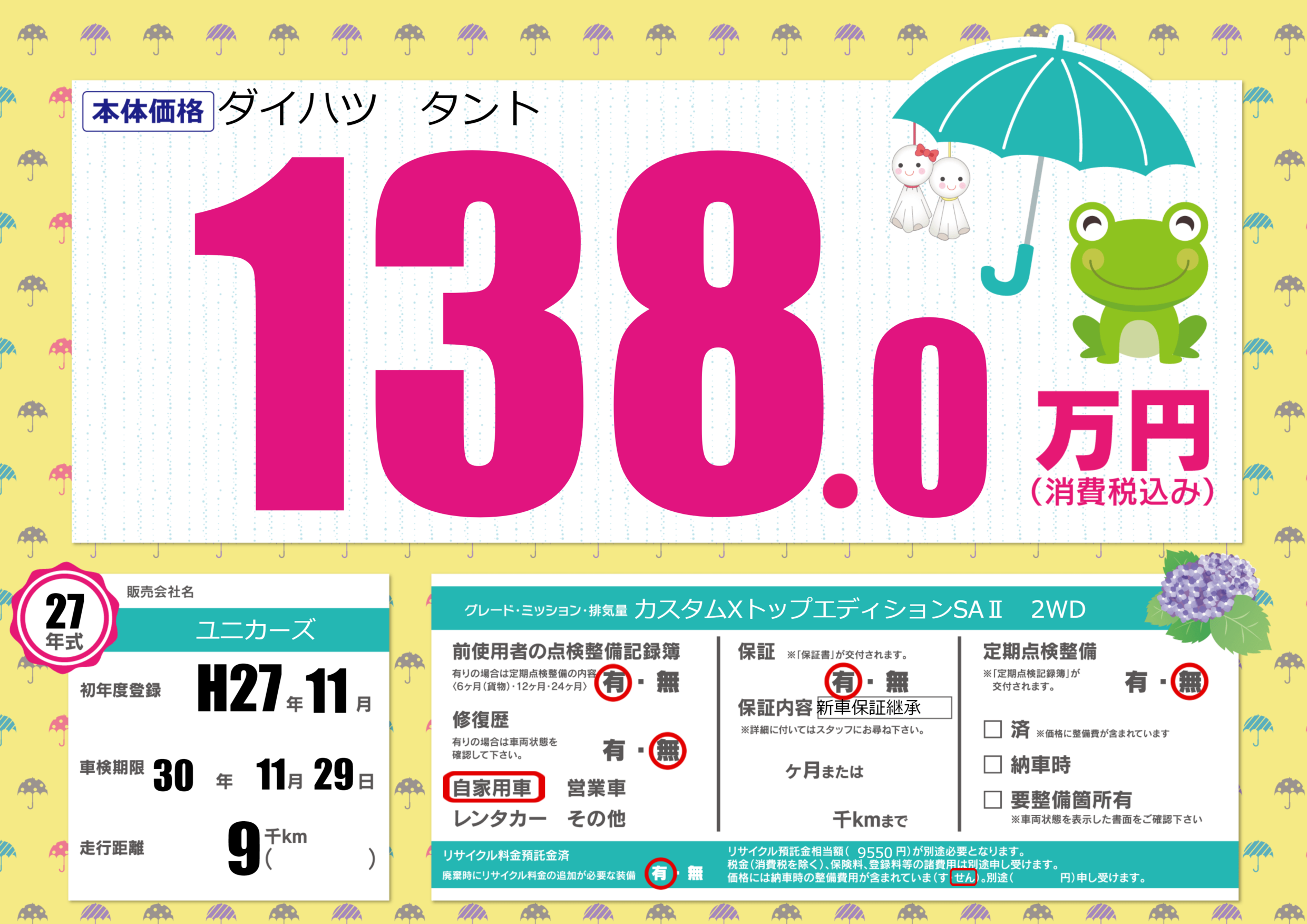 | 車名 | ダイハツ タント (売約済) | グレード ミッション 排気量 |