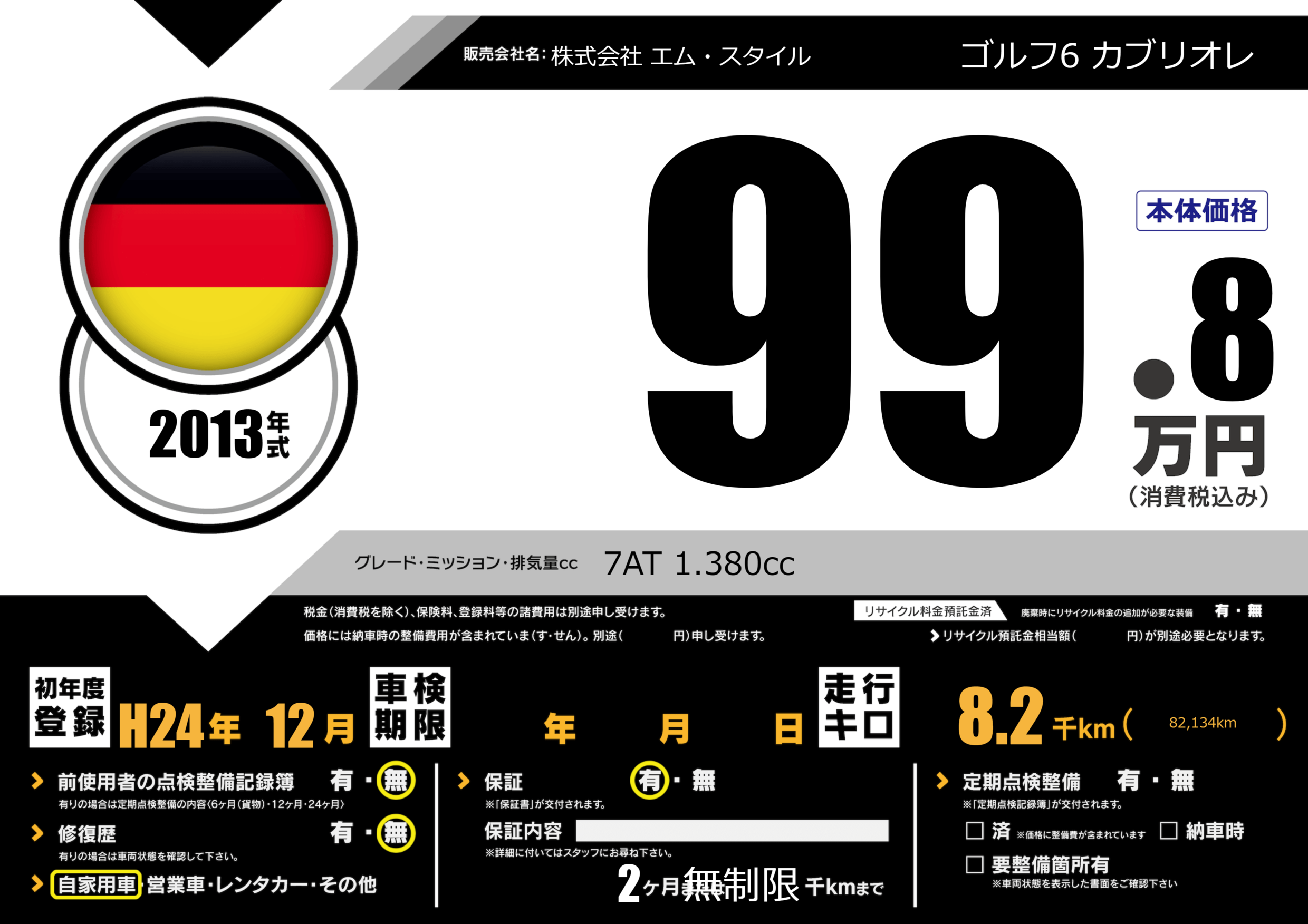 | 車名 | ゴルフ6 カブリオレ | グレード ミッション 排気量 |