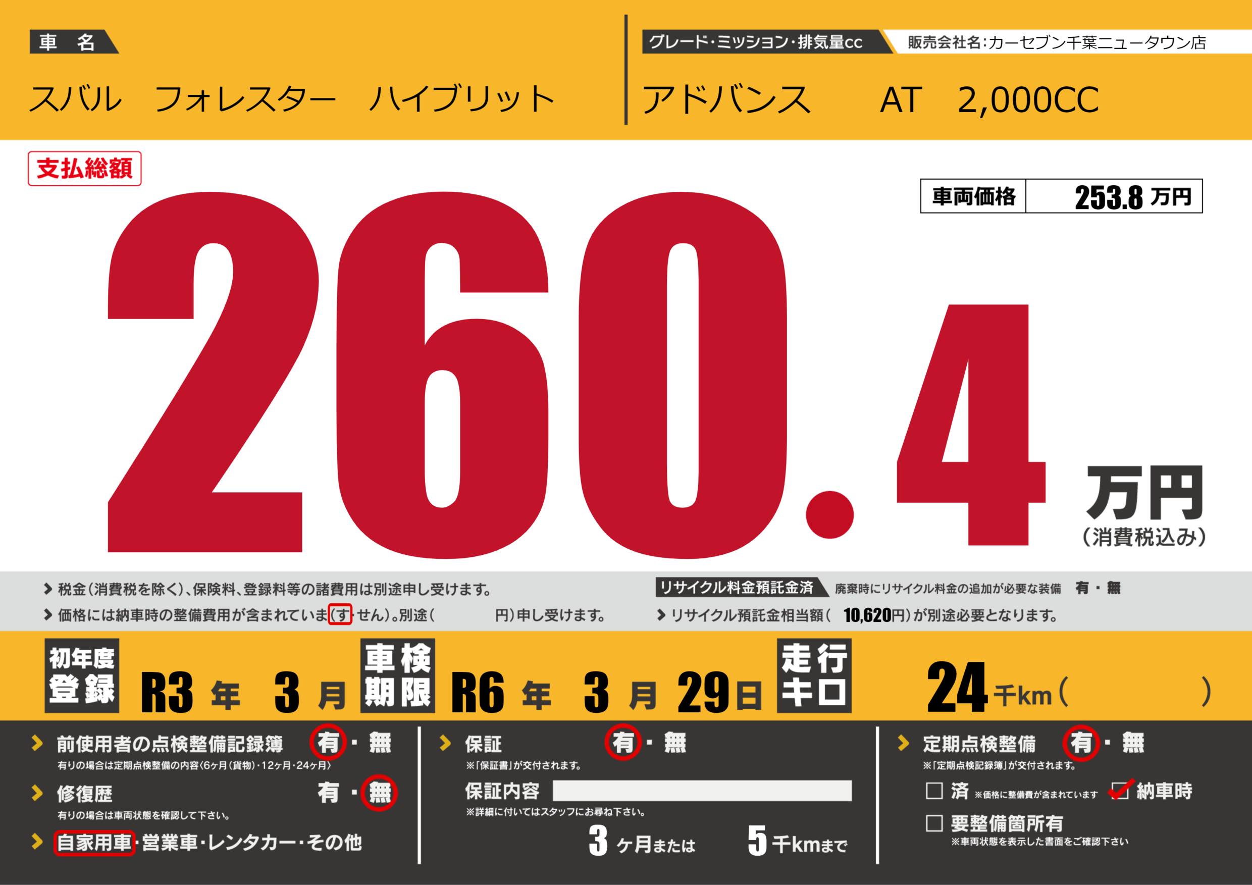 | 車名 | スバル フォレスター ハイブリット | グレード ミッション 排気量 |