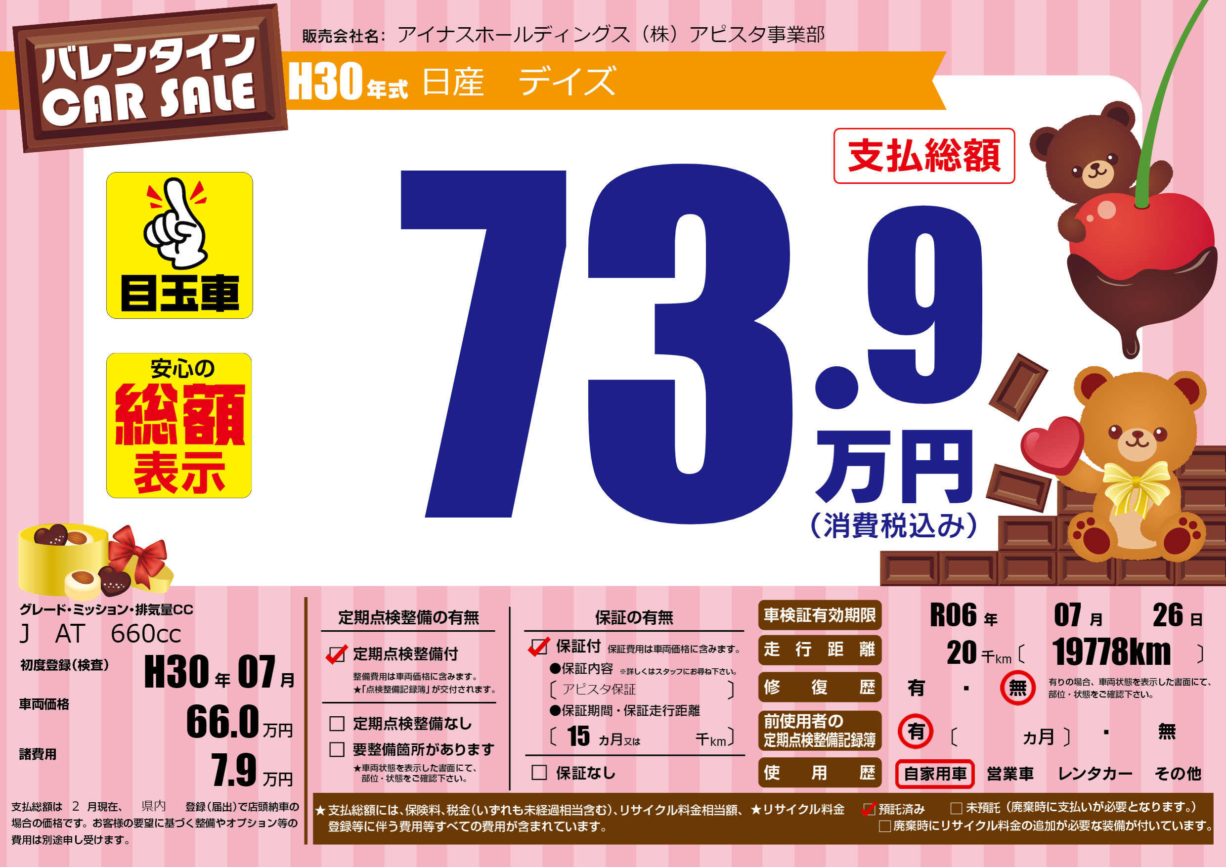 | 車名 | 日産 デイズ | グレード ミッション 排気量 |