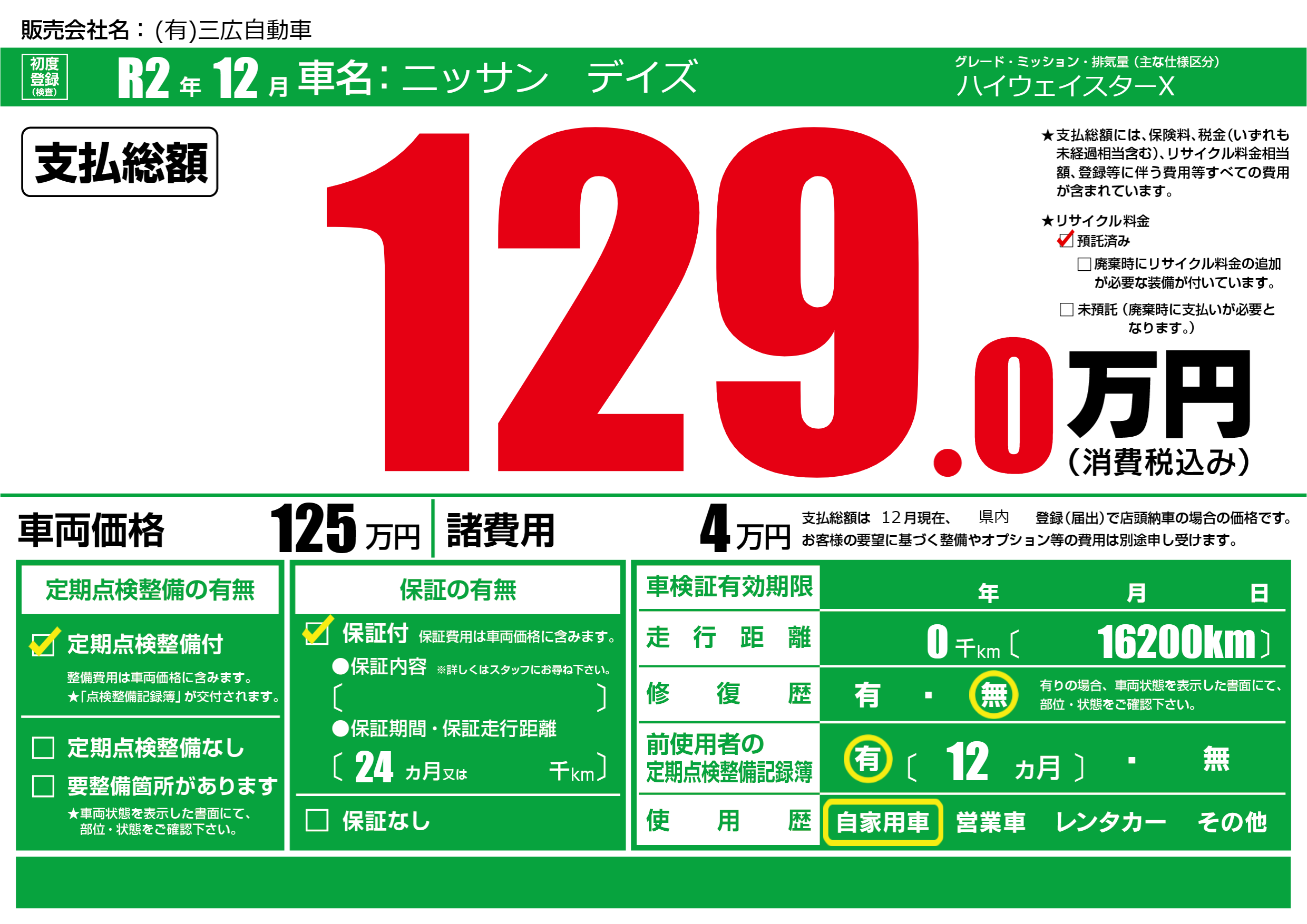 | 車名 | ニッサン デイズ | グレード ミッション 排気量 |