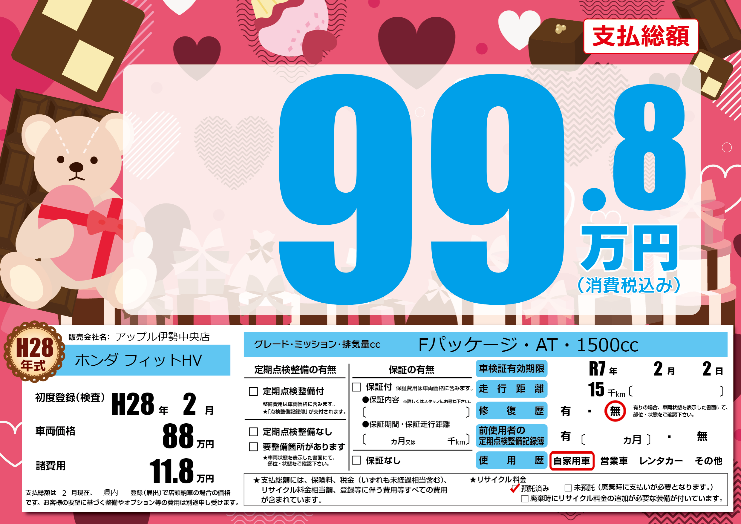 | 走行キロ | 1.5万km | 初年度登録 | H28年2月 |