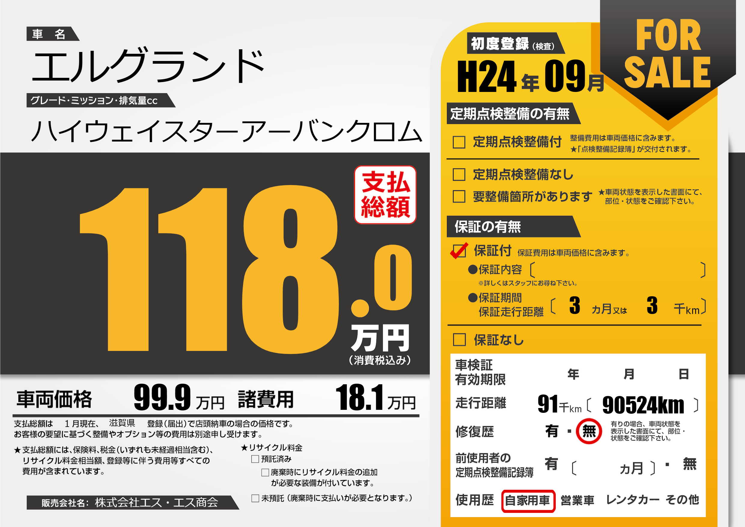 | 車名 | エルグランド | グレード ミッション 排気量 |