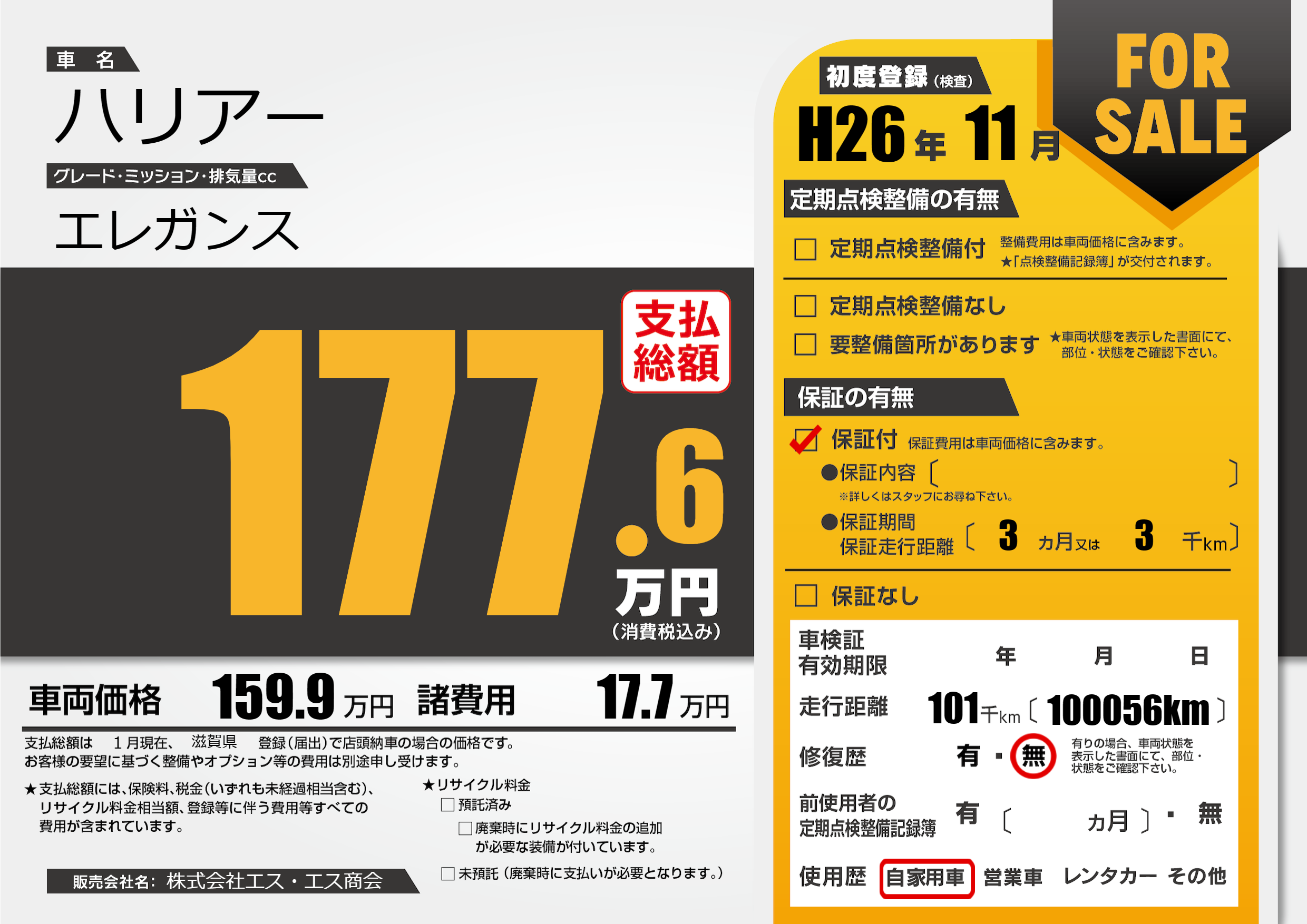 | 走行キロ | 10.1万km | 初年度登録 | H26年11月 |