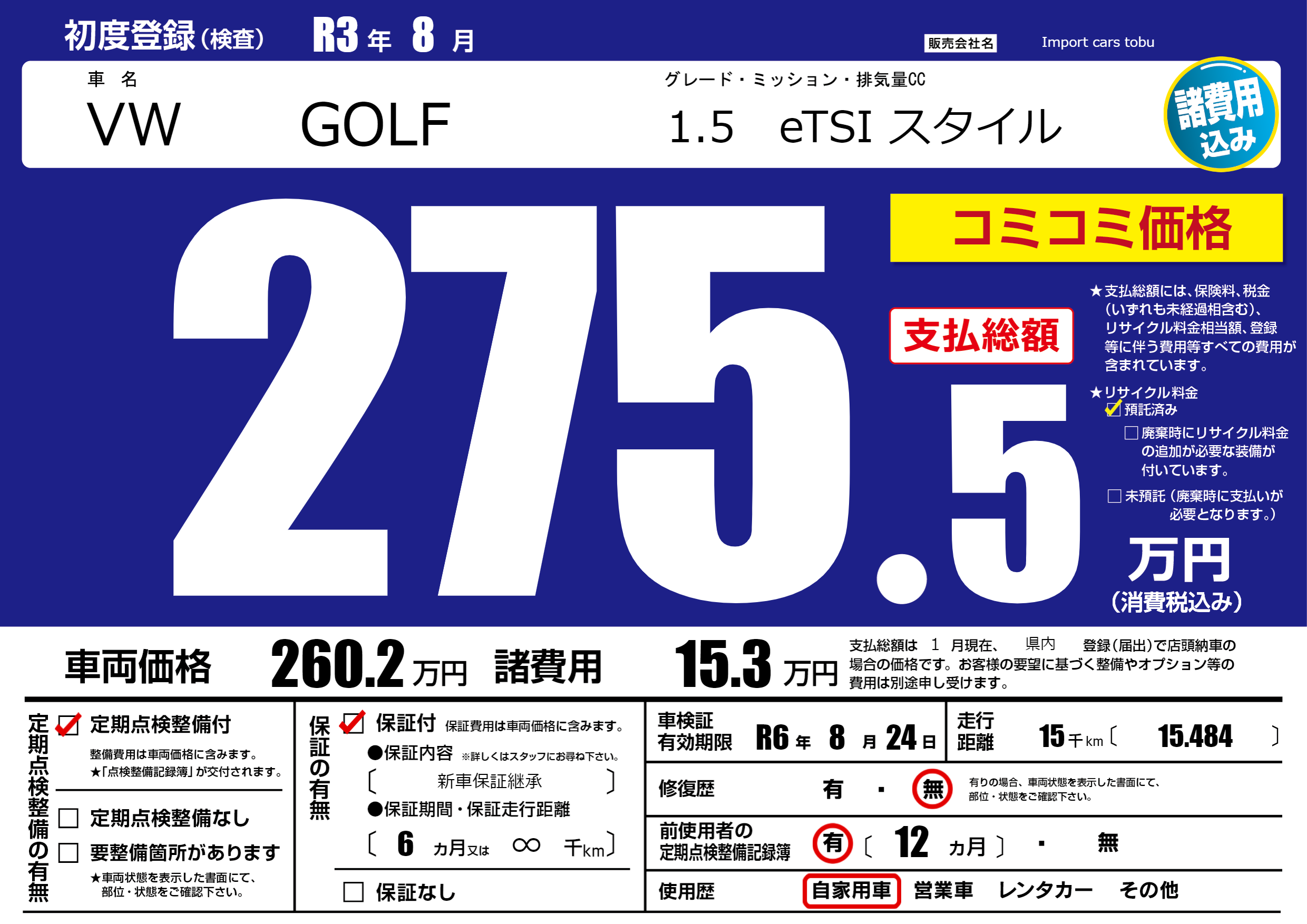 | 走行キロ | 1.5万km | 初年度登録 | R3年8月 |