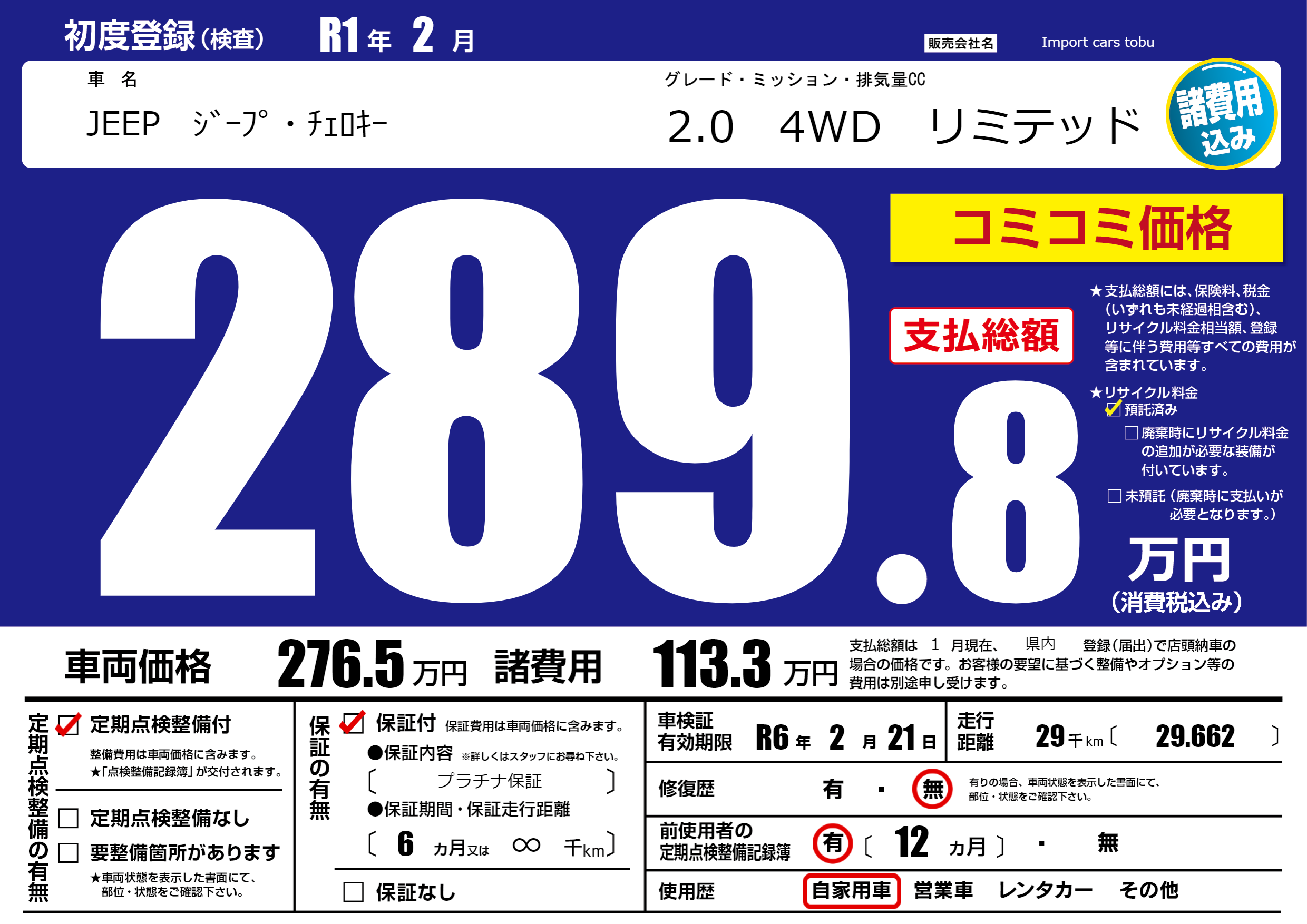 保証付き 保証内容( プラチナ保証) 6ヶ月または(∞)千kmまで |