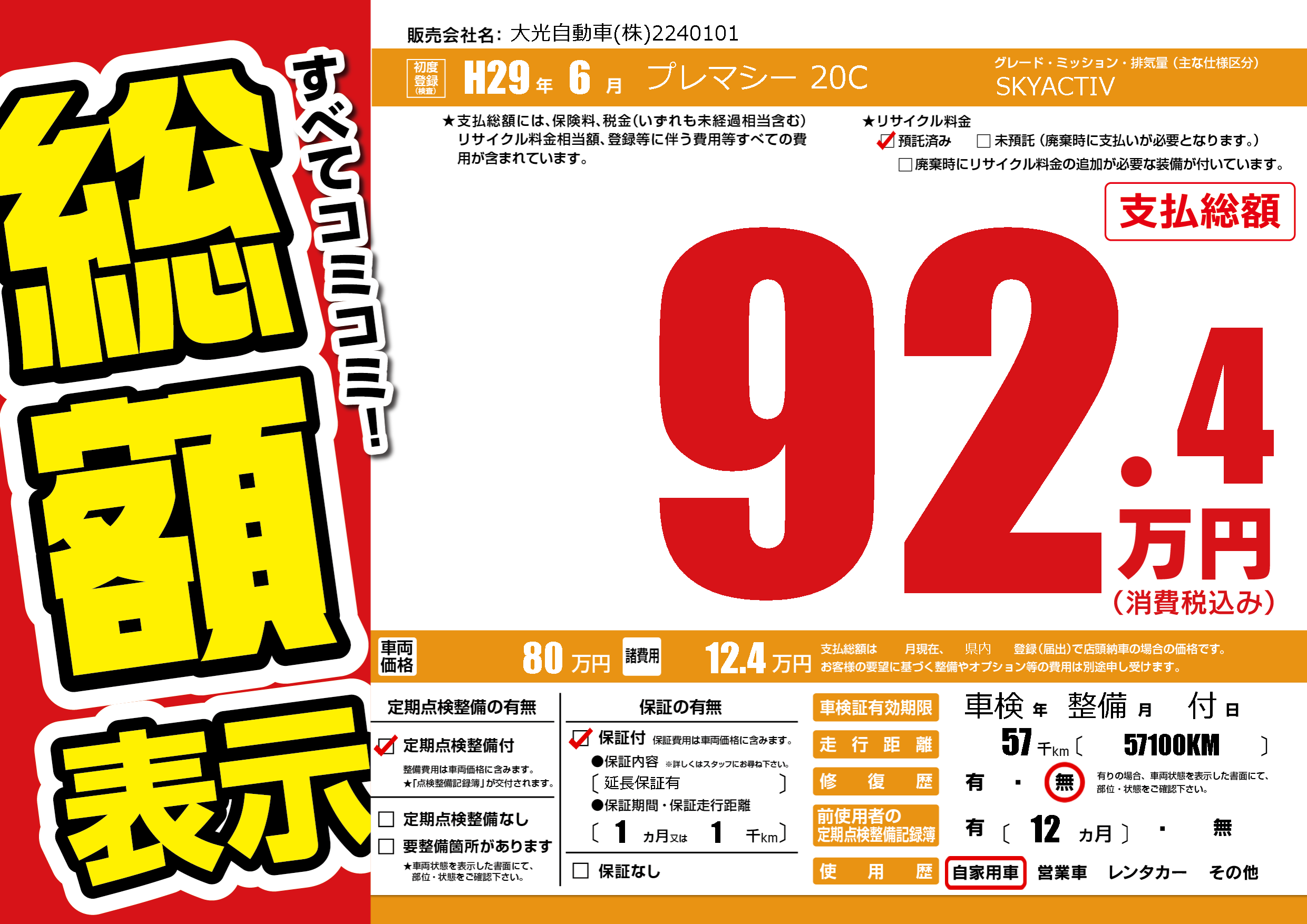 | 車名 | プレマシー 20C | グレード ミッション 排気量 |