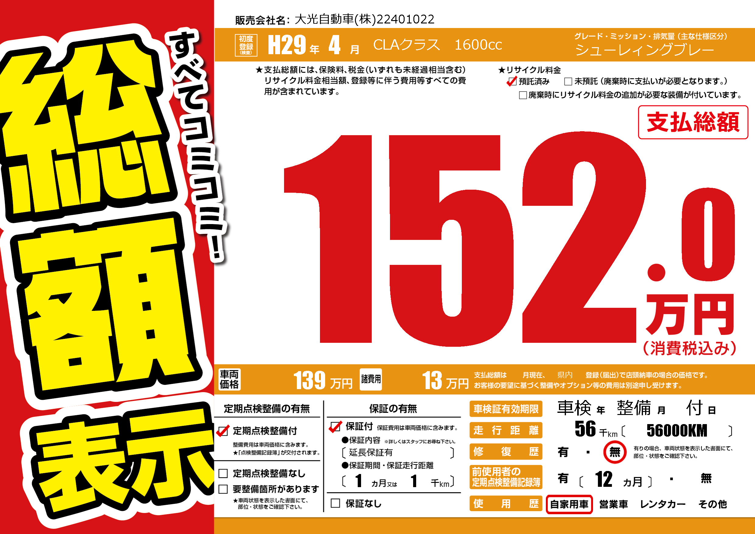 | 車名 | CLAクラス 1600cc | グレード ミッション 排気量 |