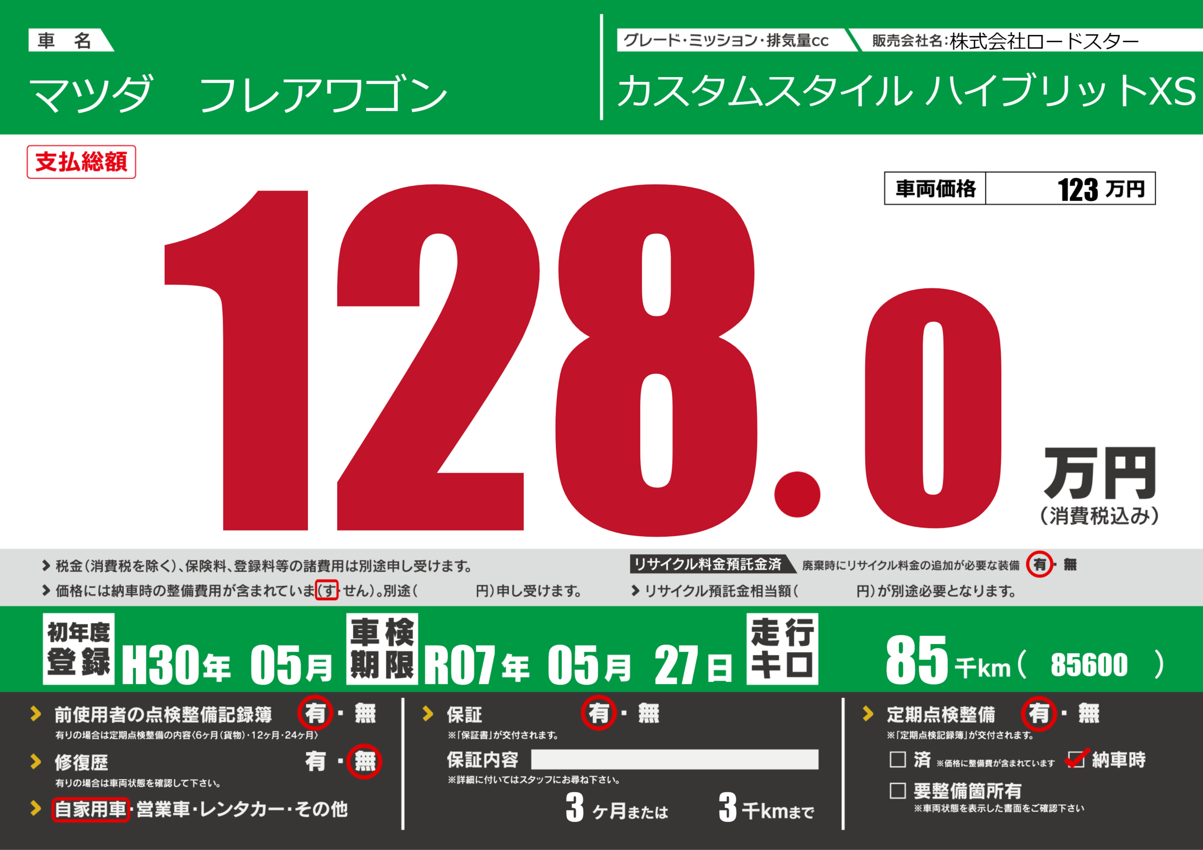 | 車名 | マツダ フレアワゴン | グレード ミッション 排気量 |