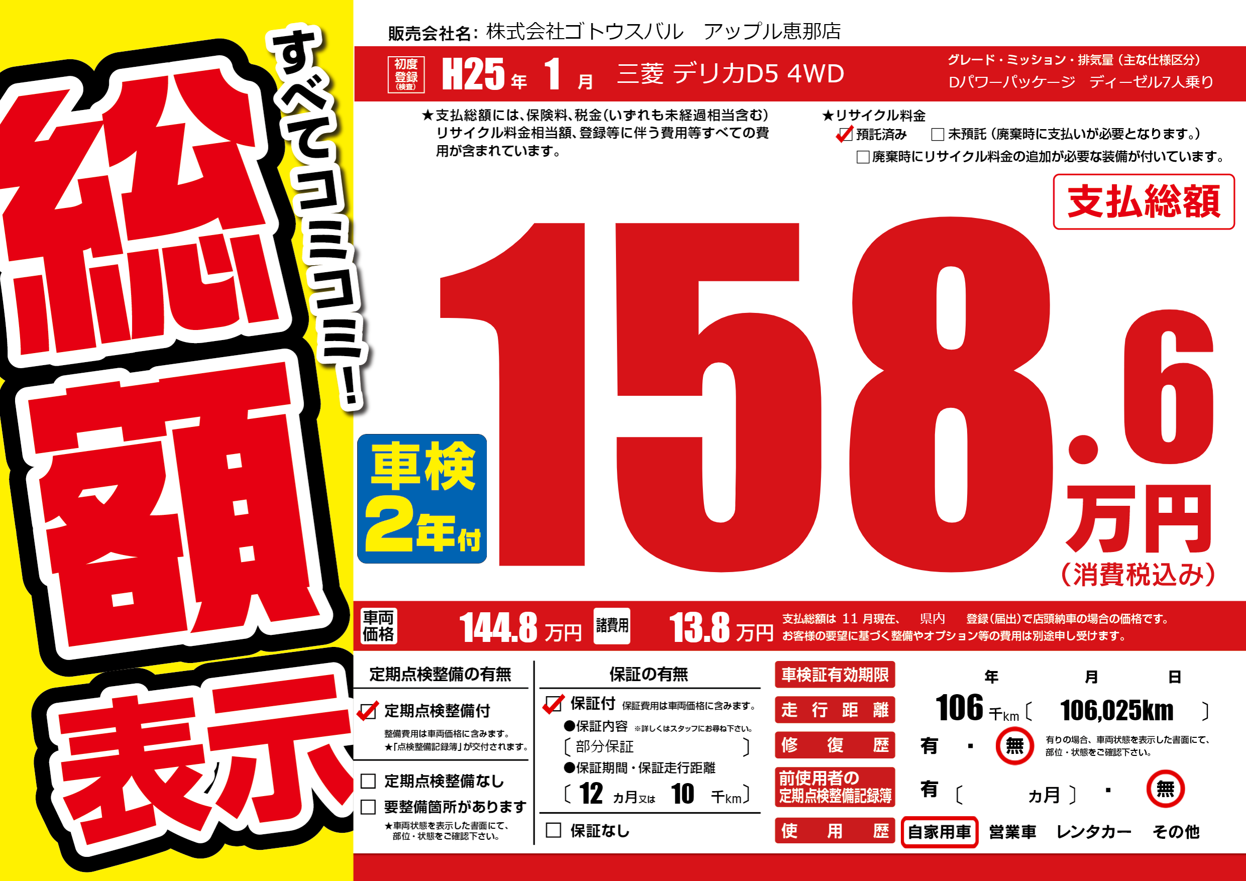 | 車名 | 三菱 デリカD5 4WD | グレード ミッション 排気量 |