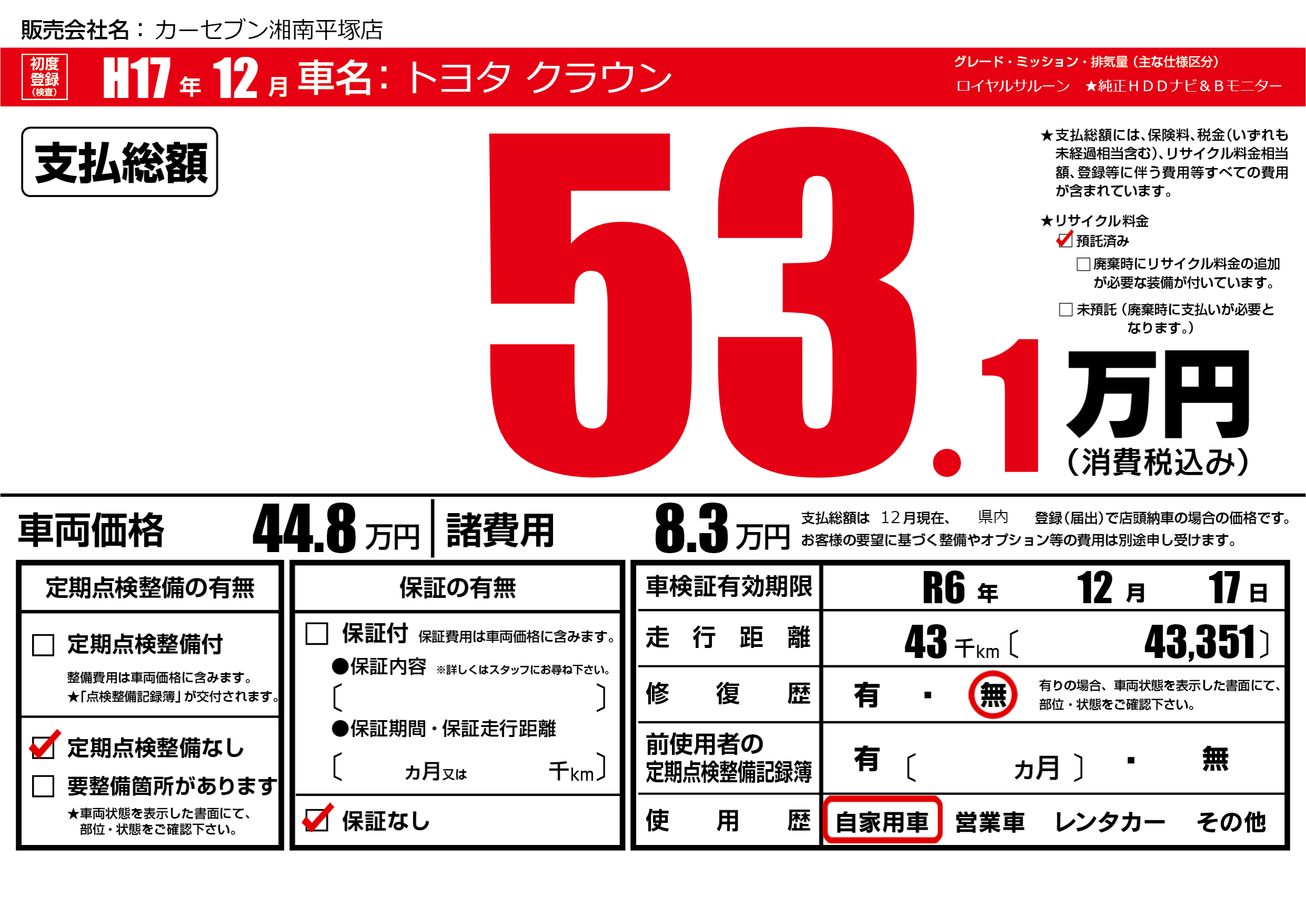 | 走行キロ | 4.3万km | 初年度登録 | H17年12月 |